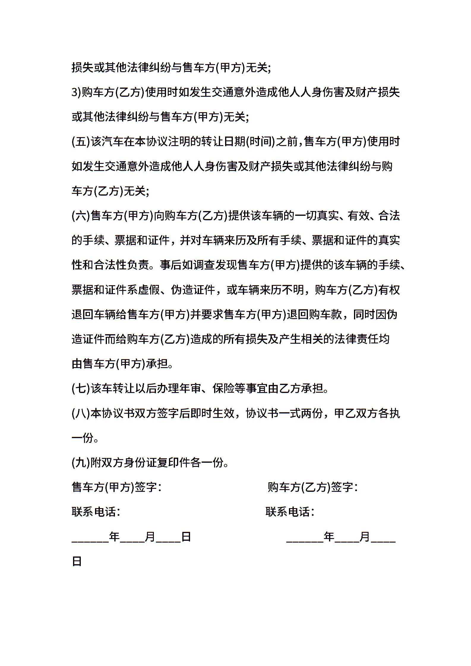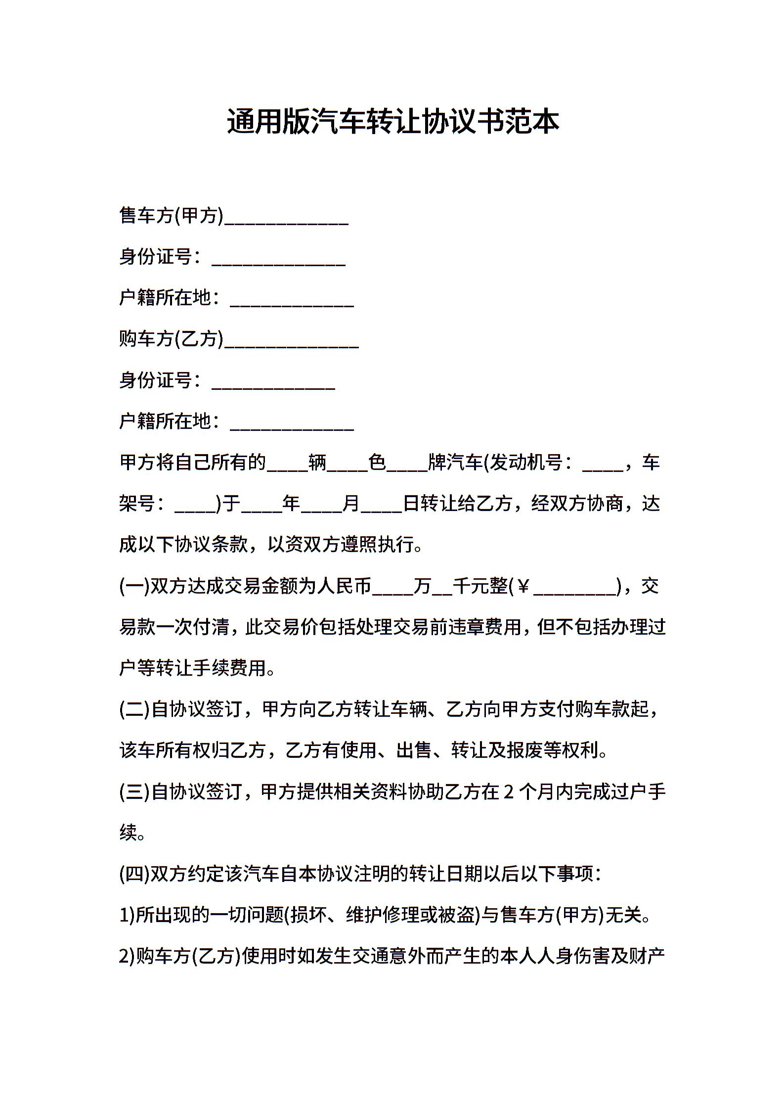 通用版汽车转让协议书范本