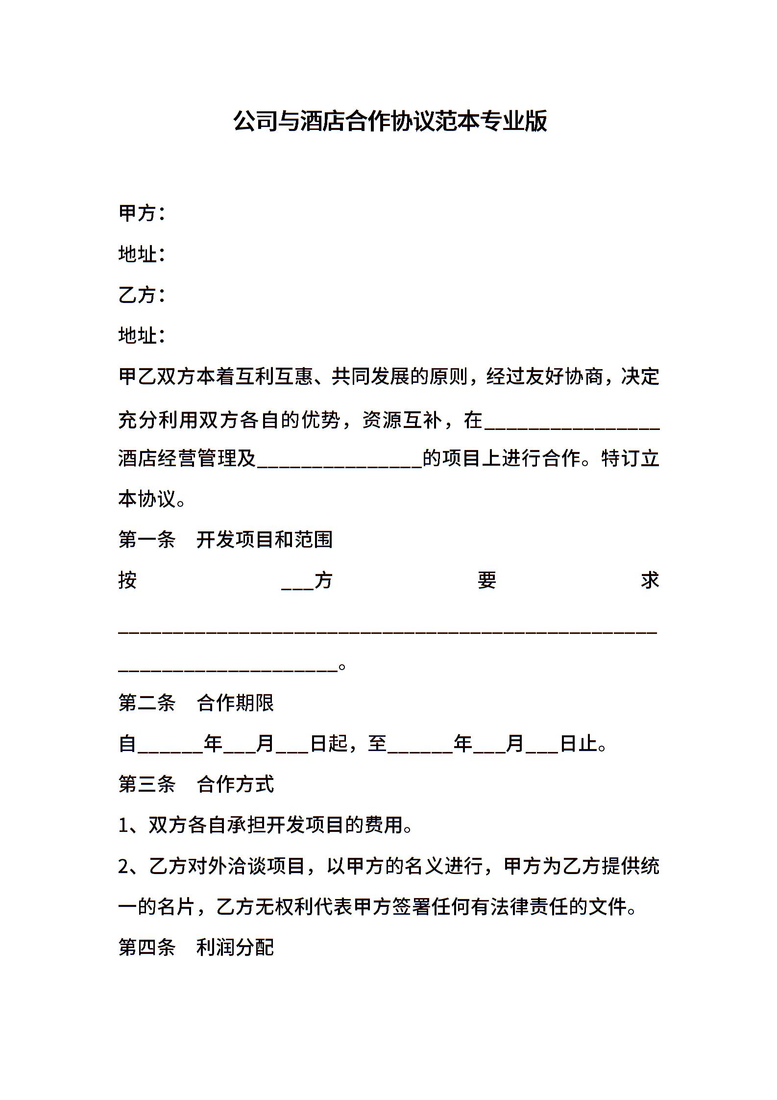 公司与酒店合作协议范本专业版