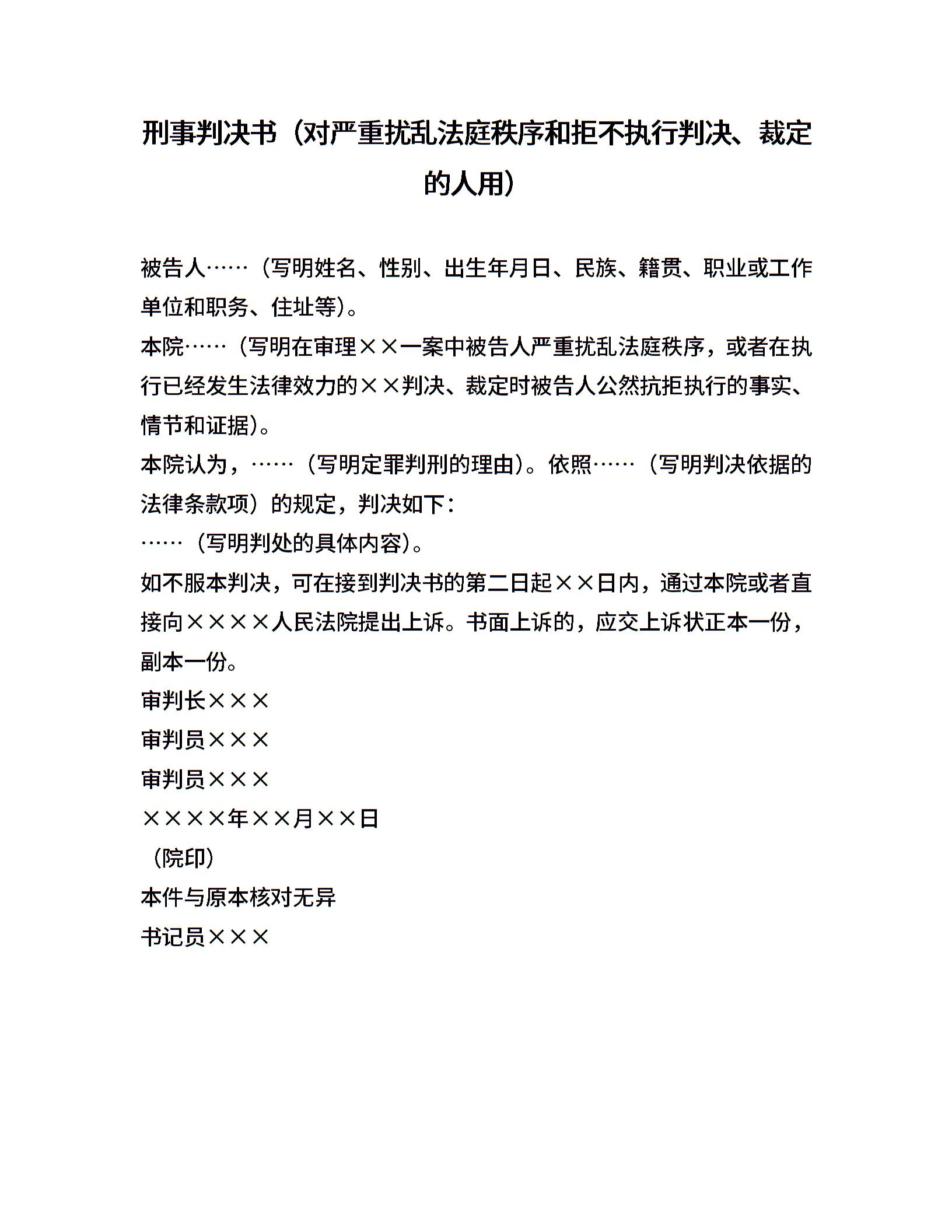 刑事判决书(对严重扰乱法庭秩序和拒不执行判决、裁定的人用)