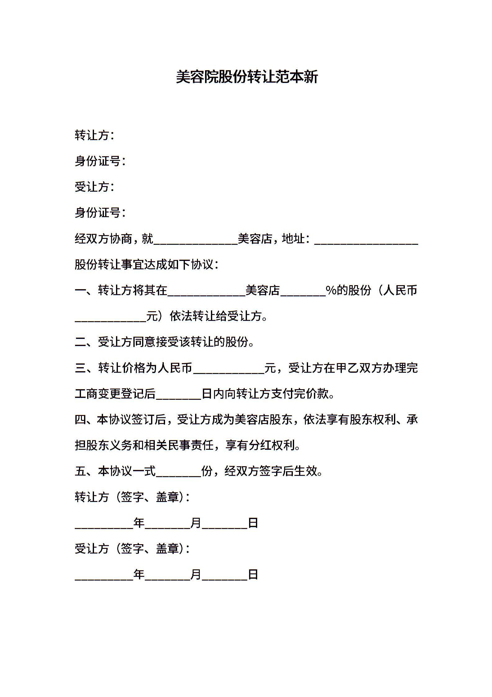 美容院股份转让范本新