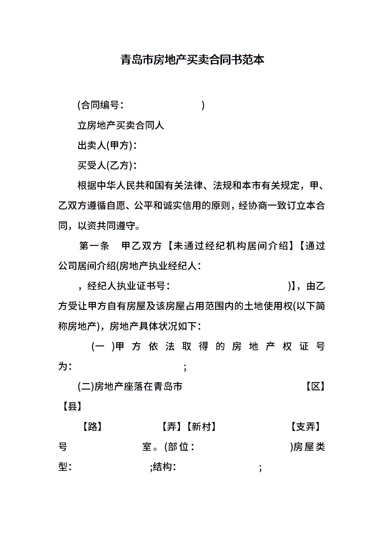 青岛市房地产买卖合同书范本
