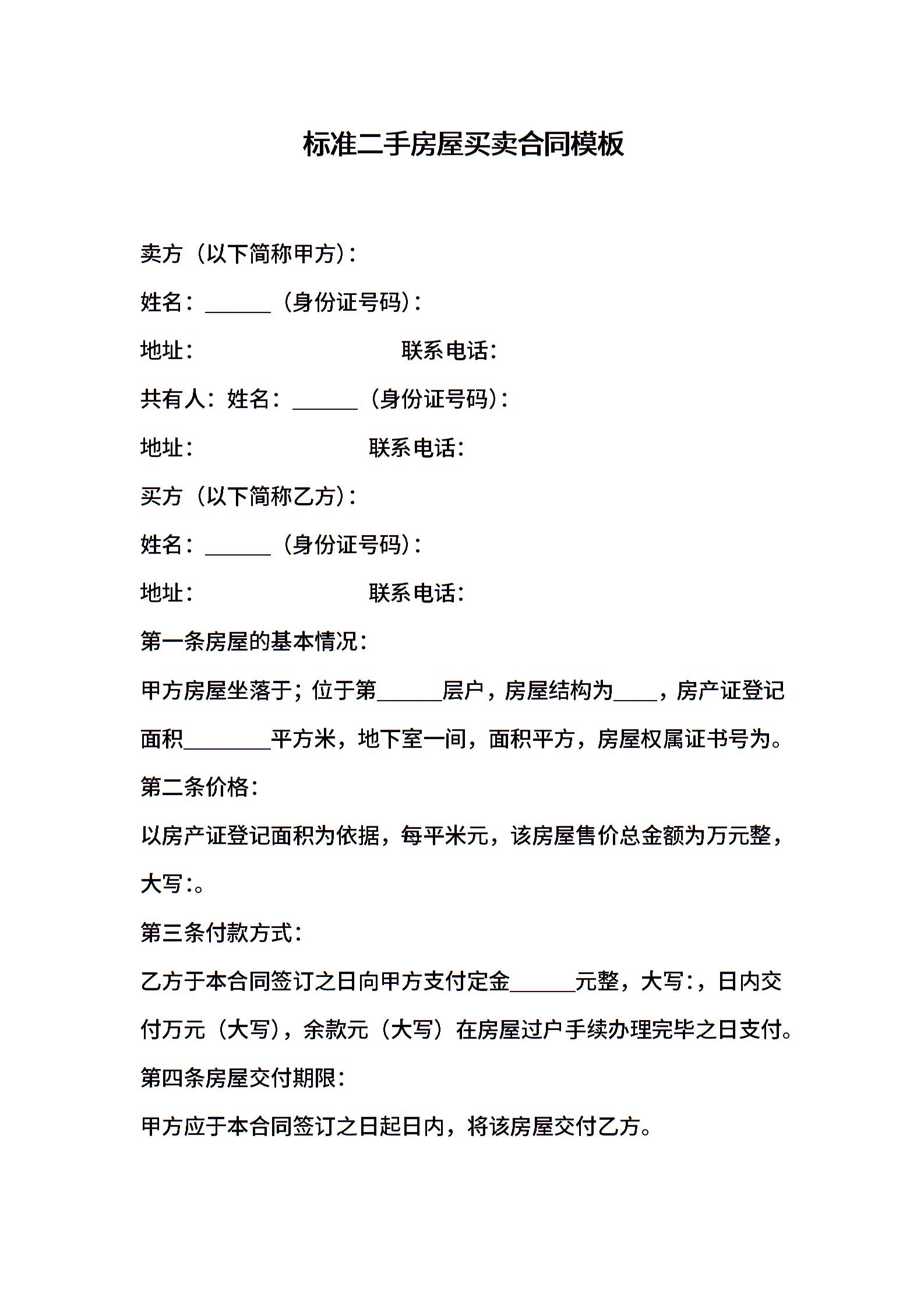标准二手房屋买卖合同模板