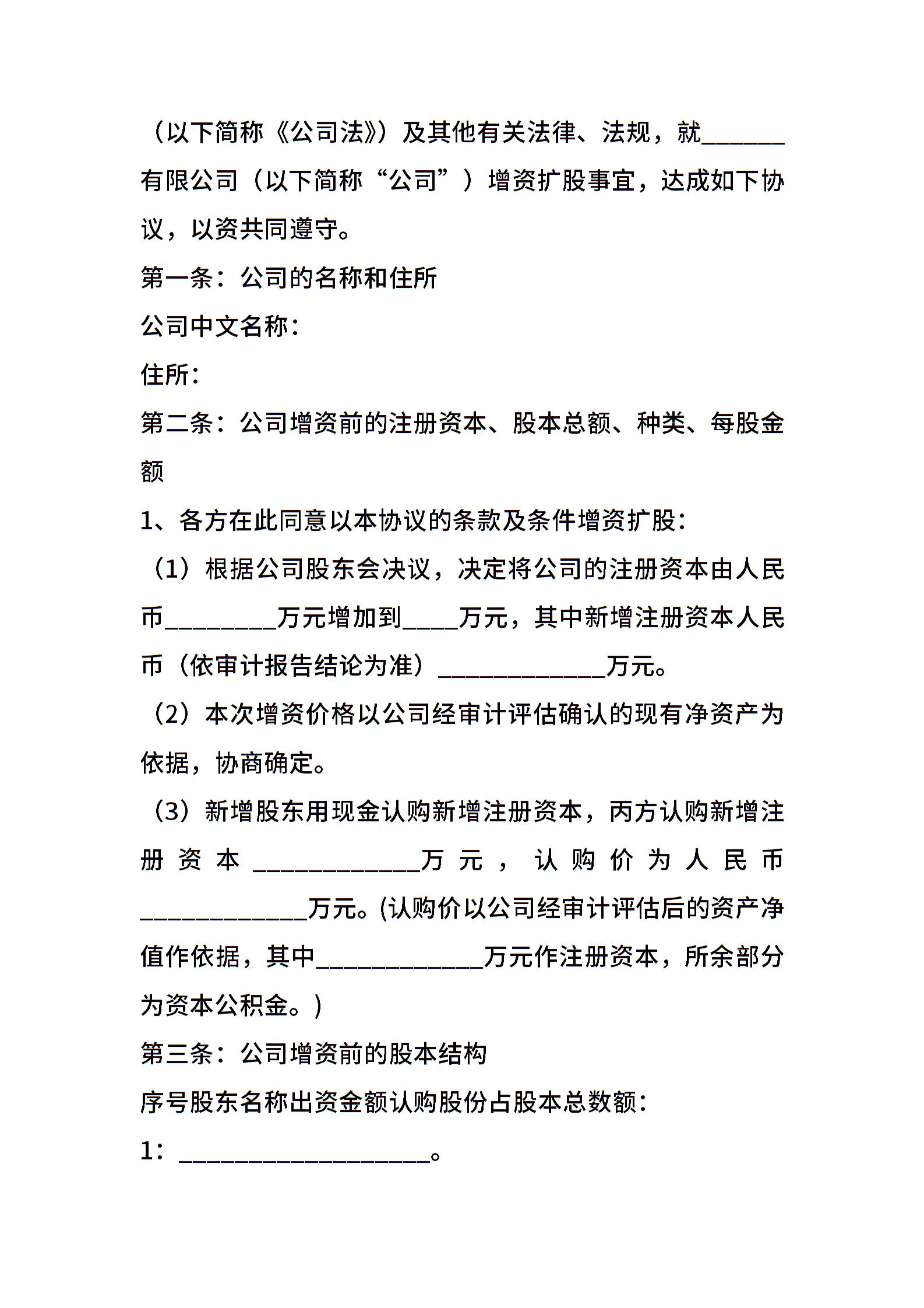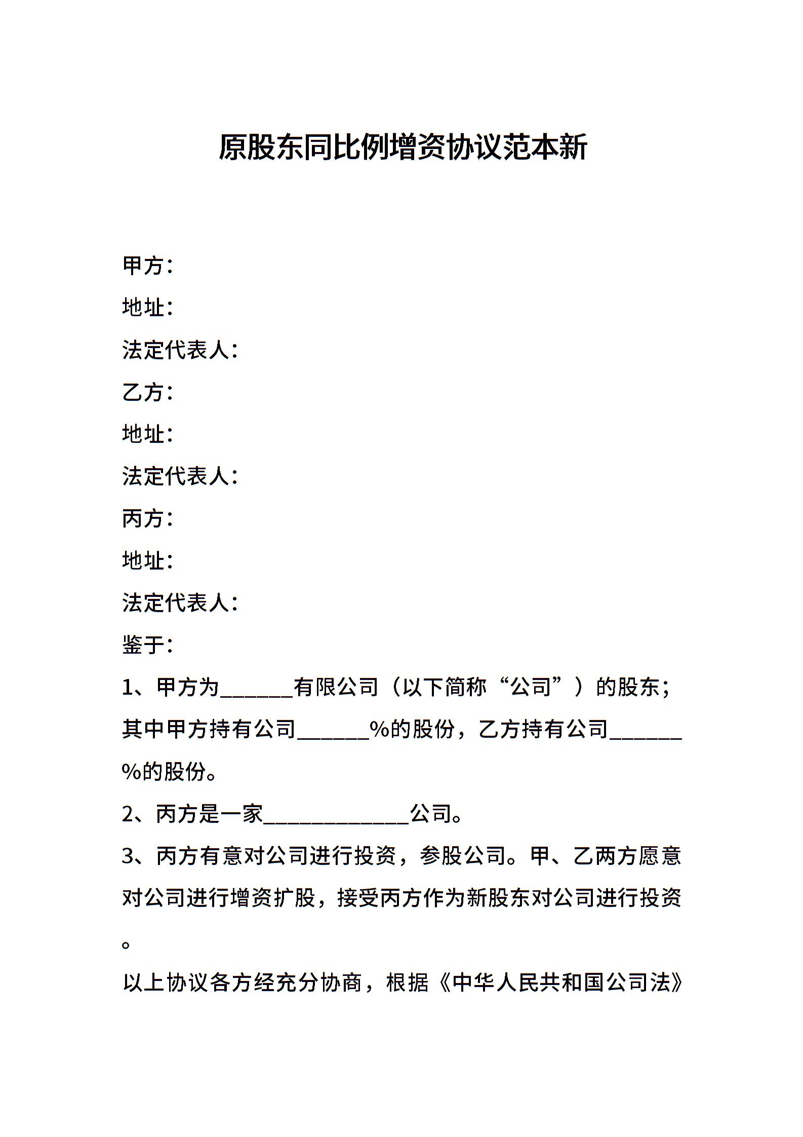 原股东同比例增资协议范本新