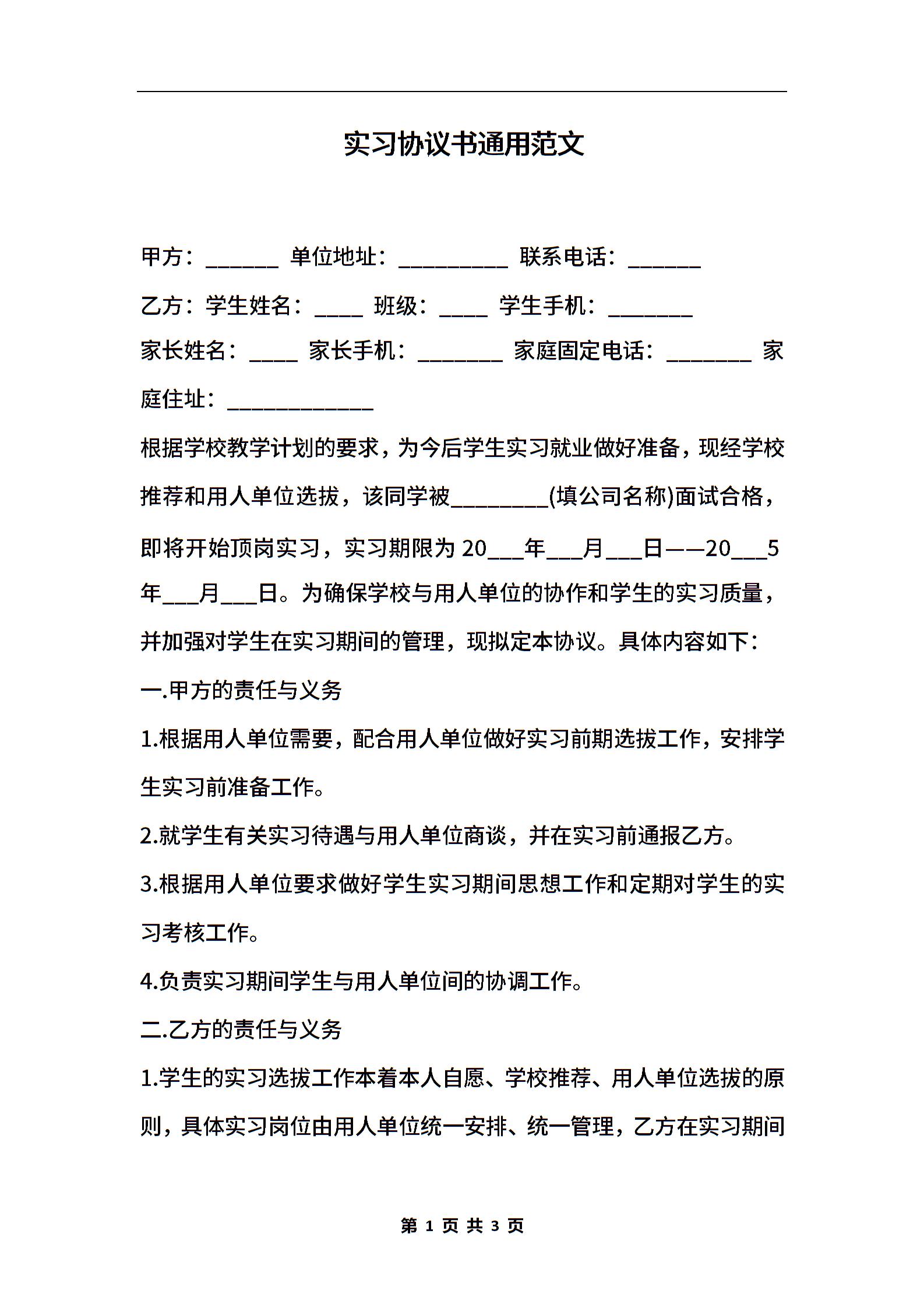 实习协议书通用范文