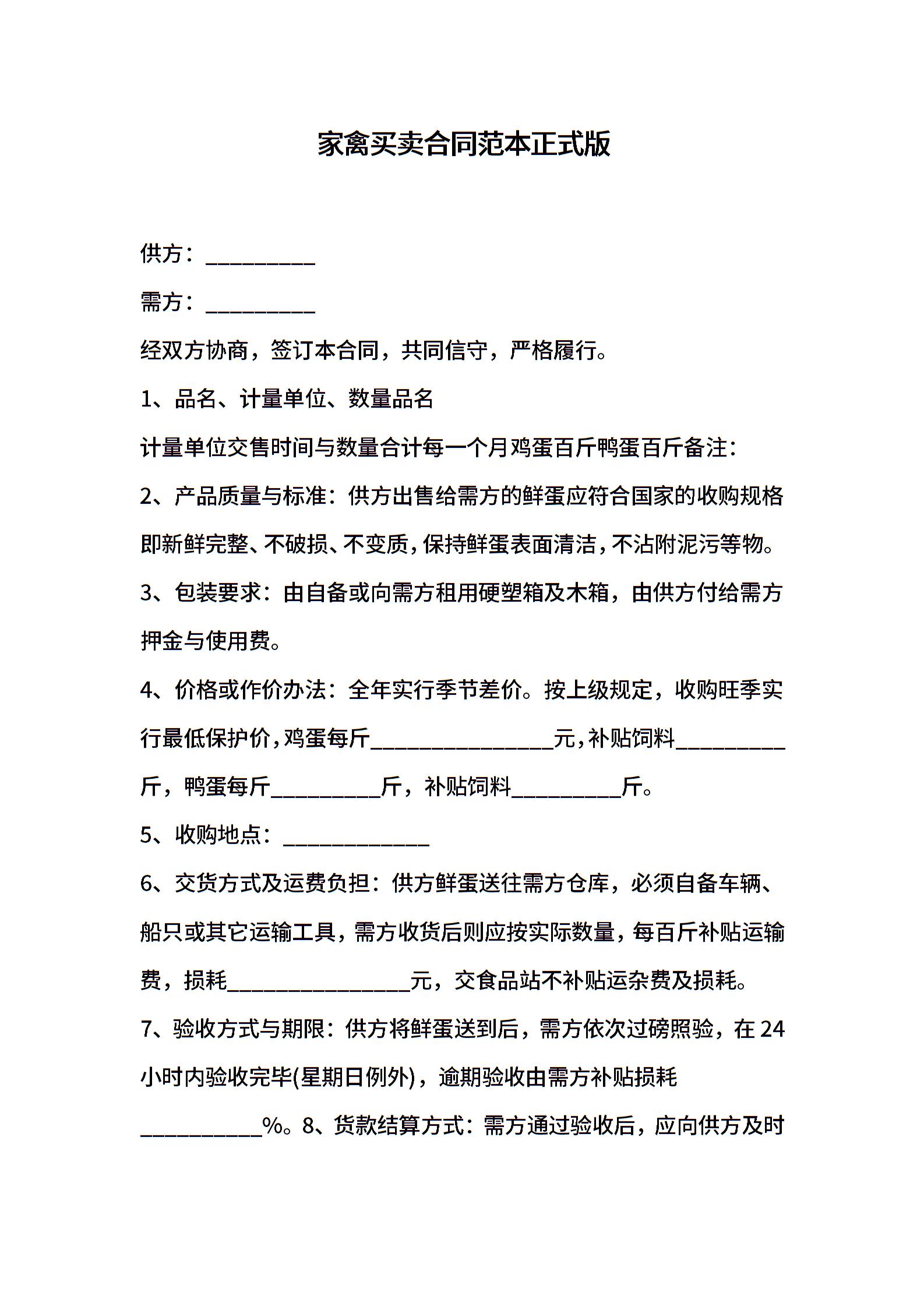 家禽买卖合同范本正式版