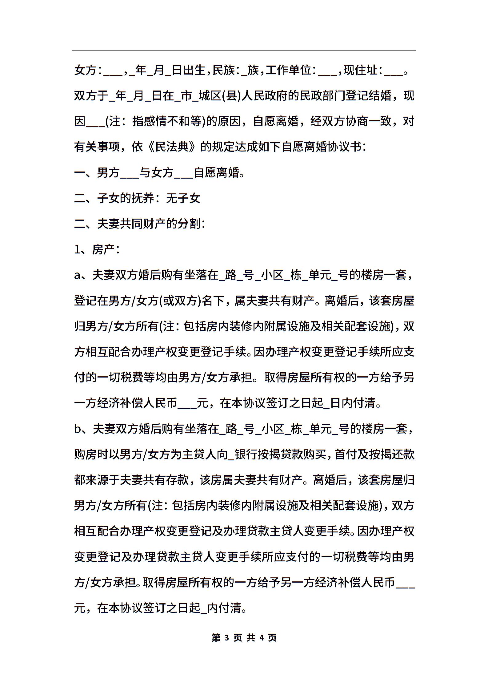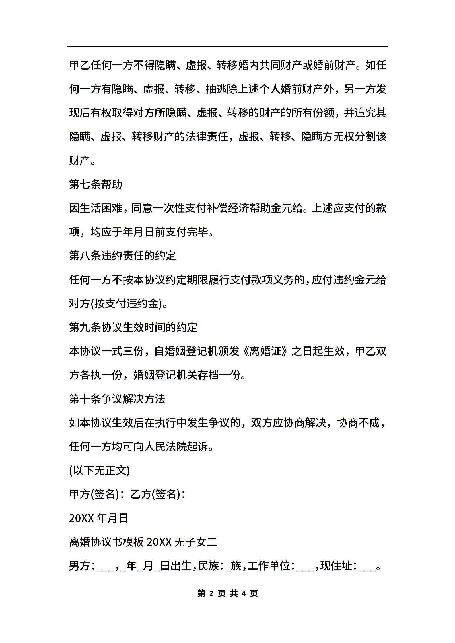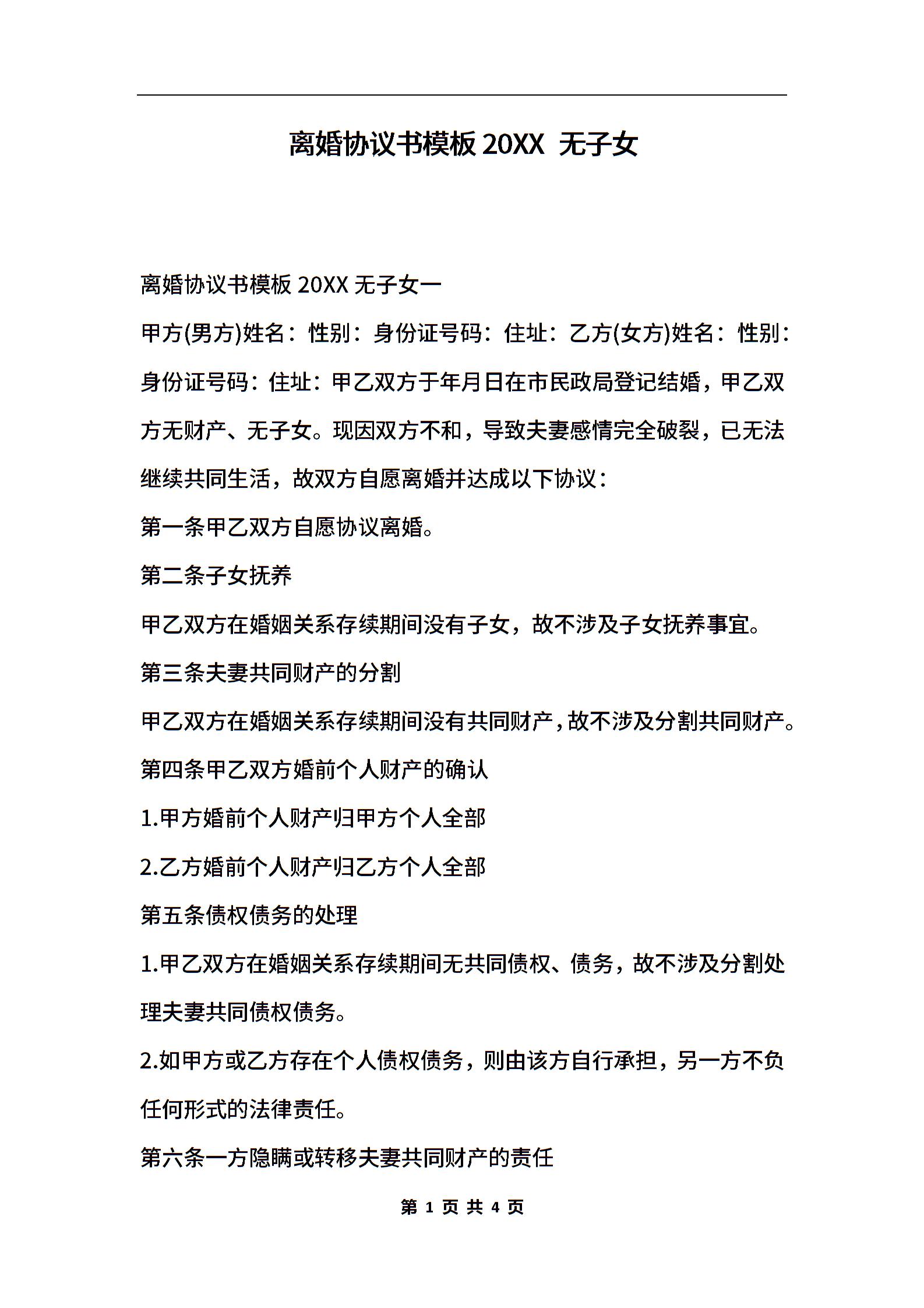 离婚协议书模板2020 无子女