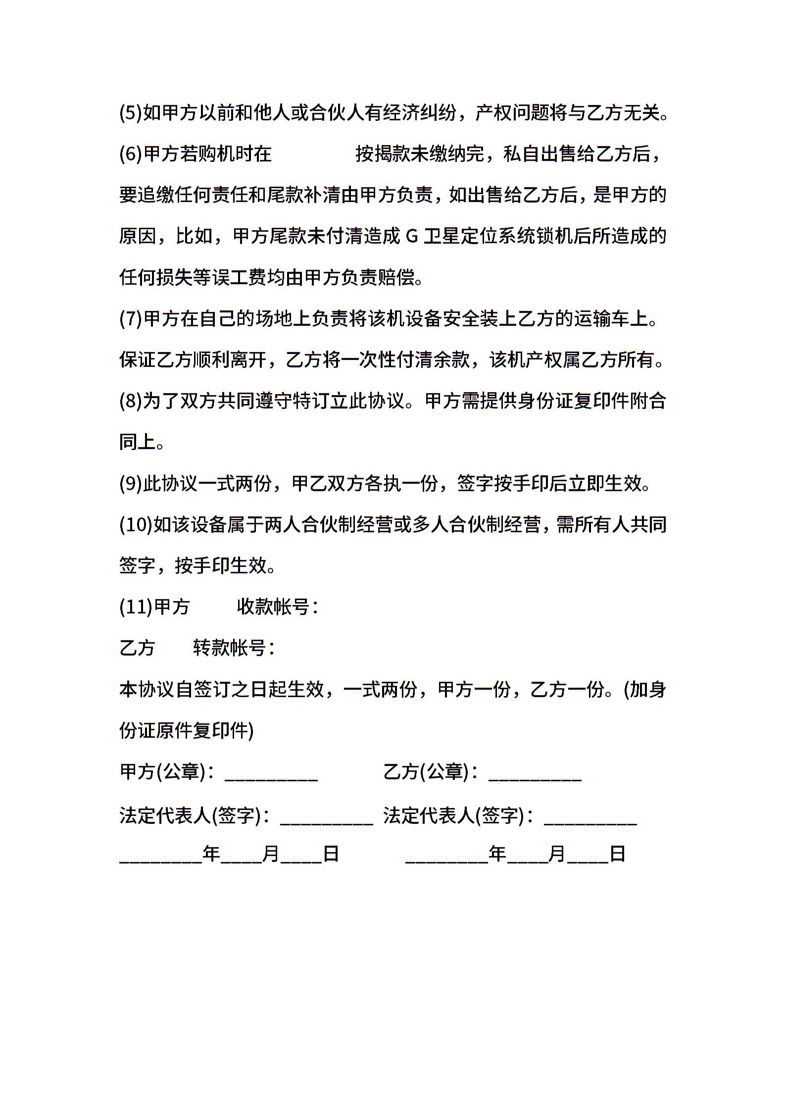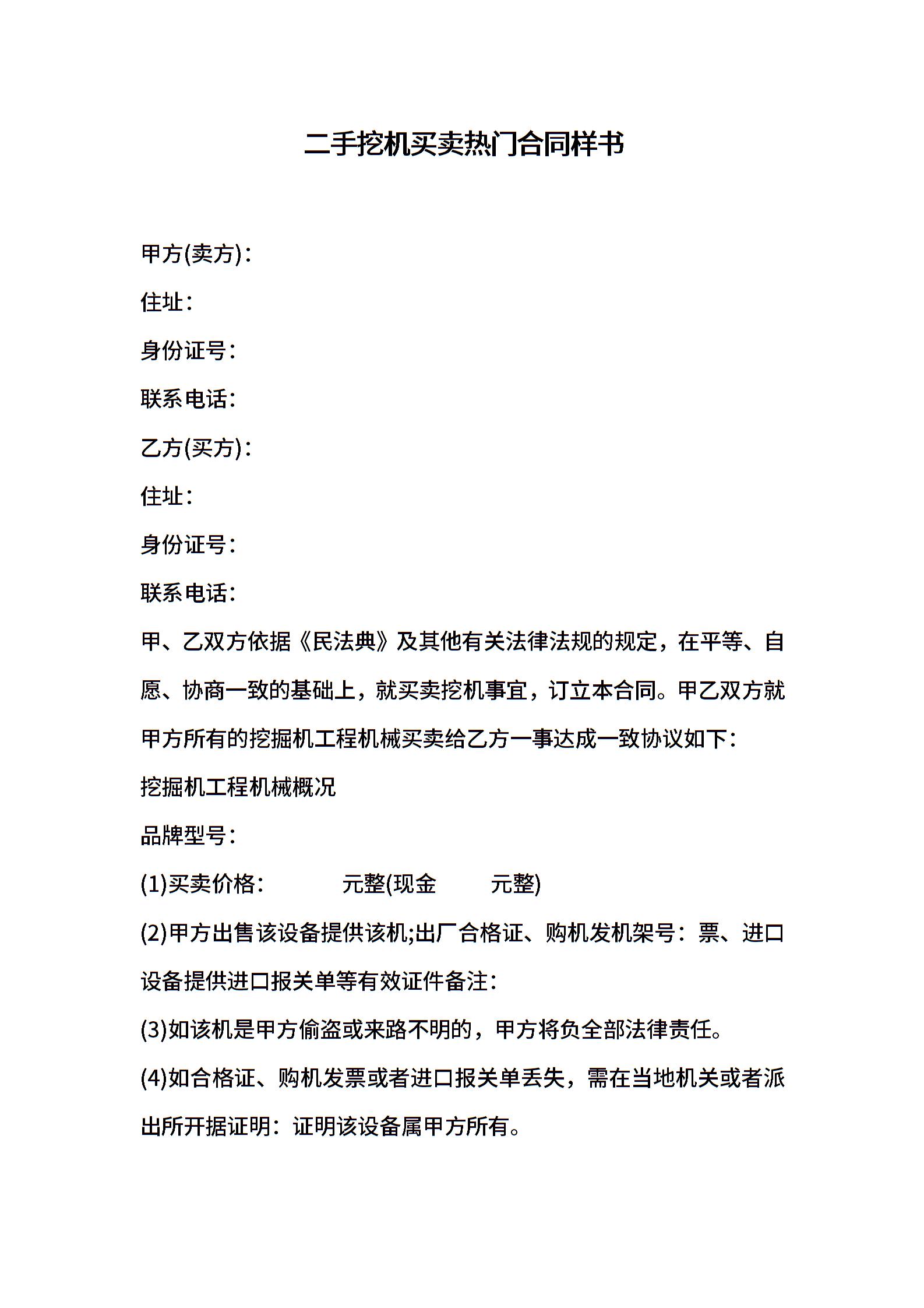 二手挖机买卖热门合同样书