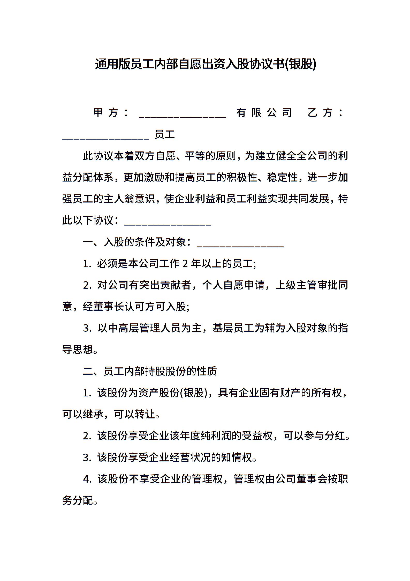 通用版员工内部自愿出资入股协议书(银股)