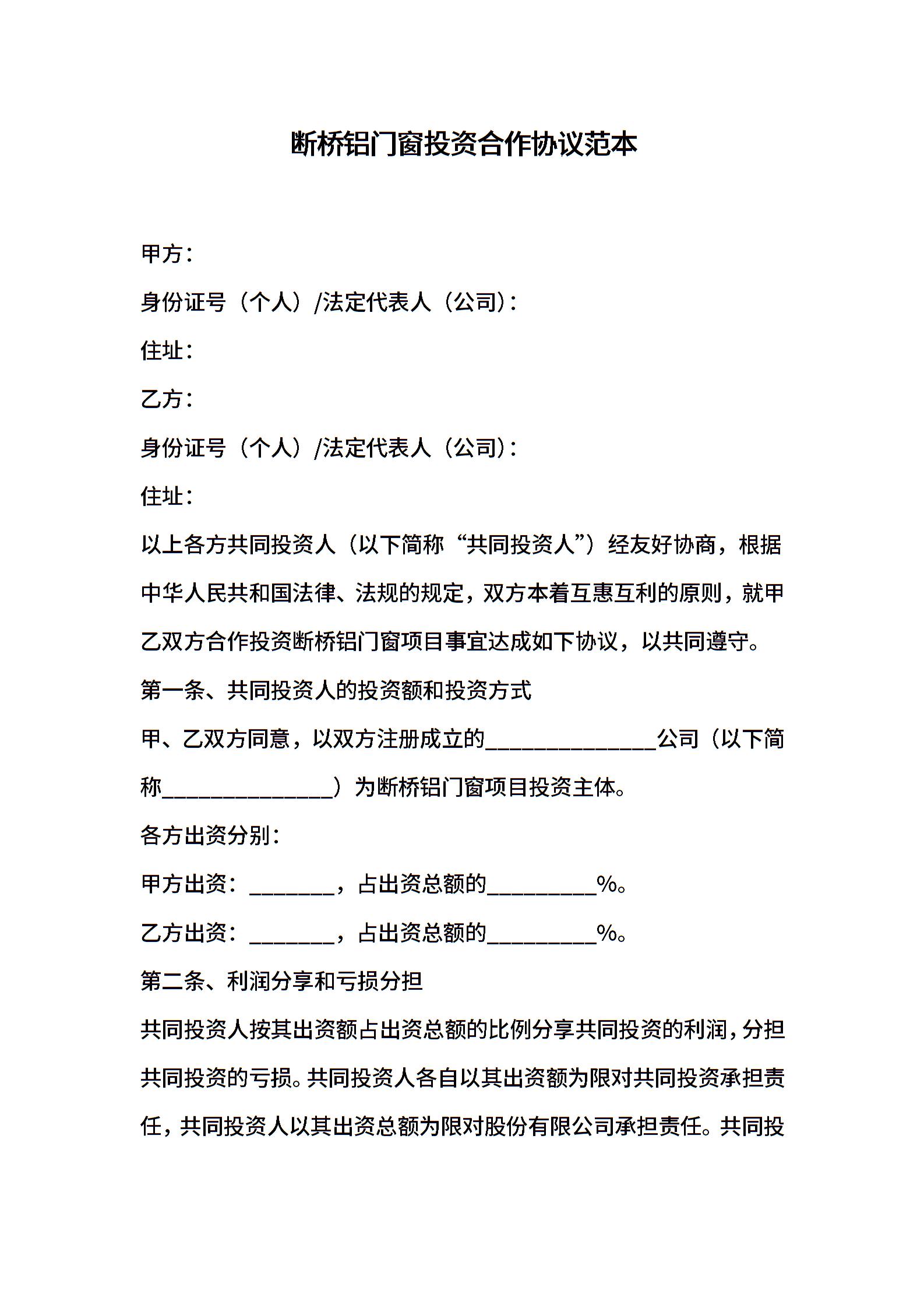 断桥铝门窗投资合作协议范本