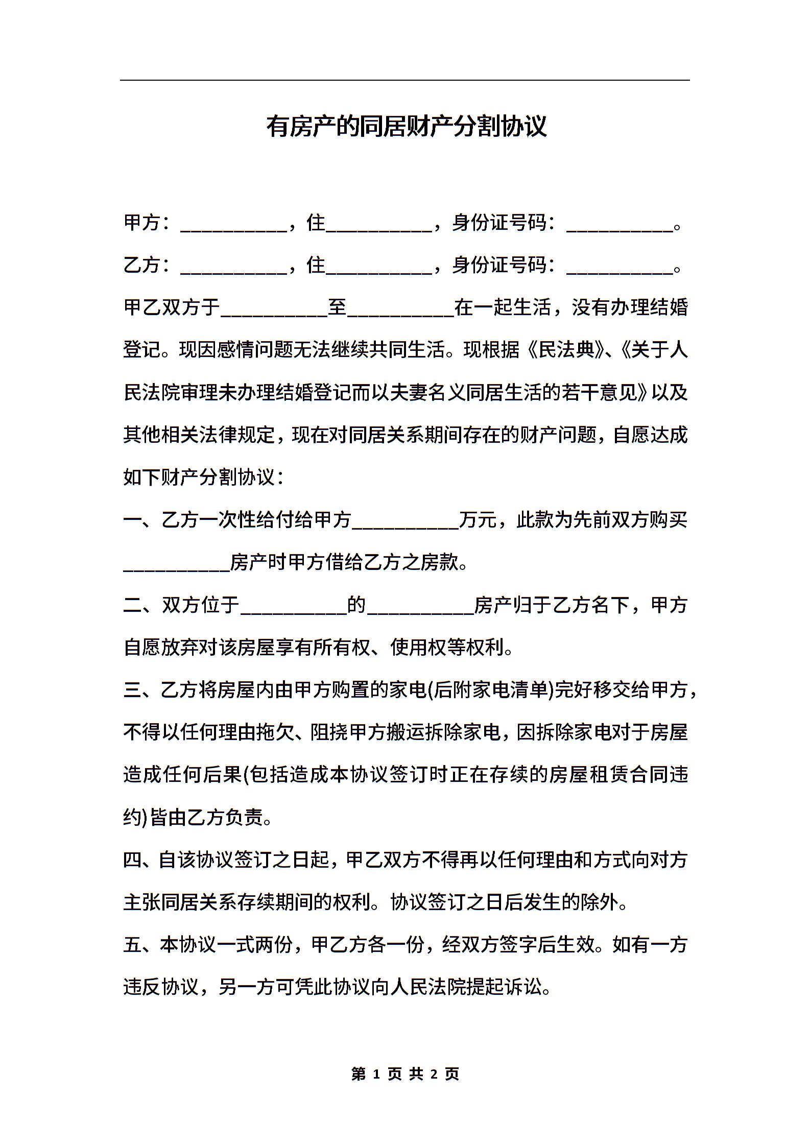 有房产的同居财产分割协议