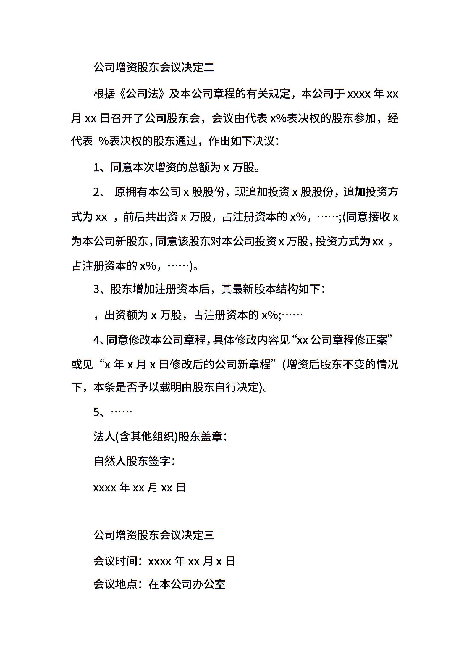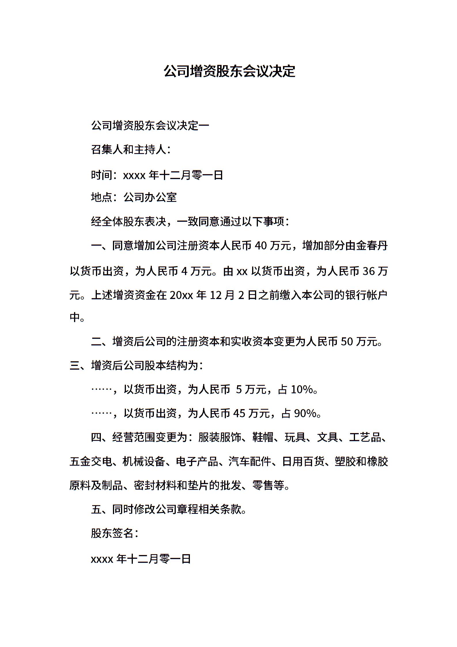 公司增资股东会议决定