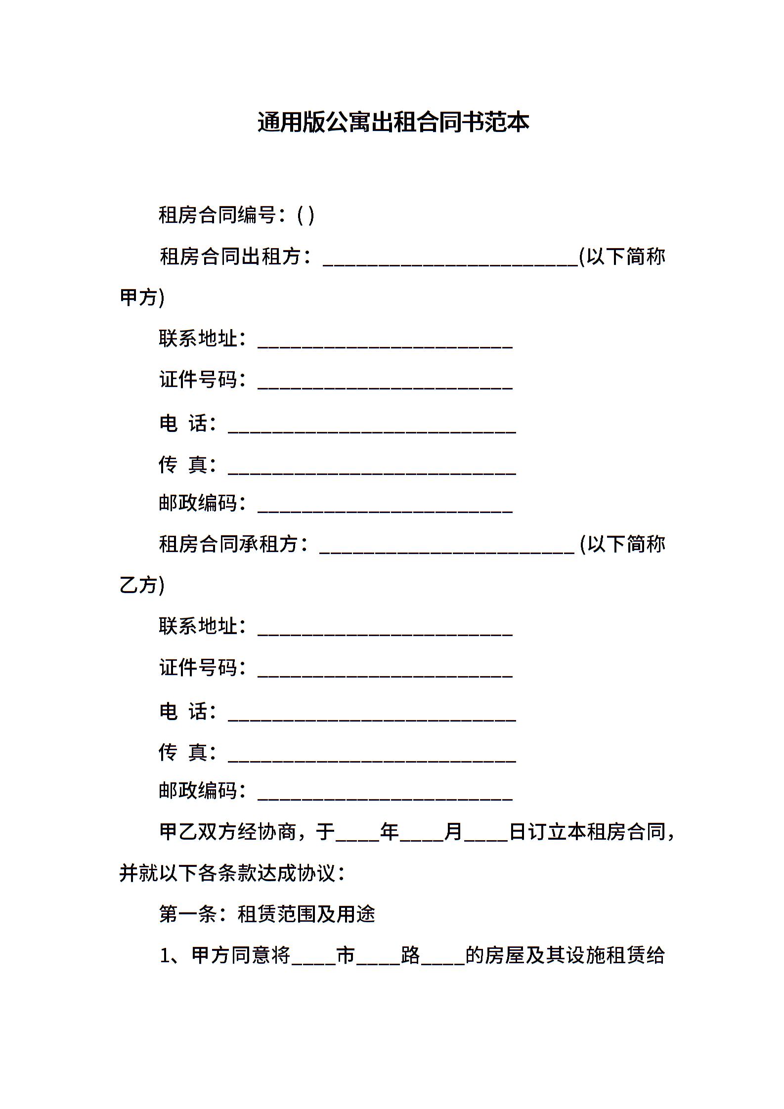 通用版公寓出租合同书范本