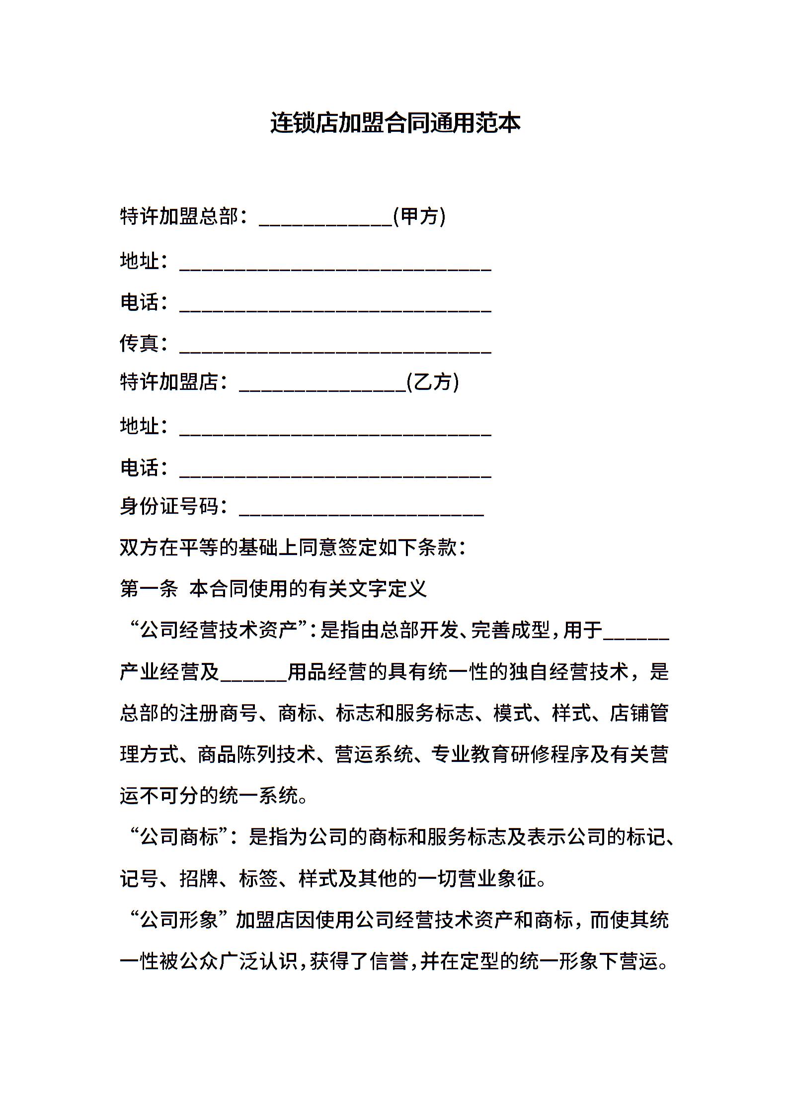 连锁店加盟合同通用范本