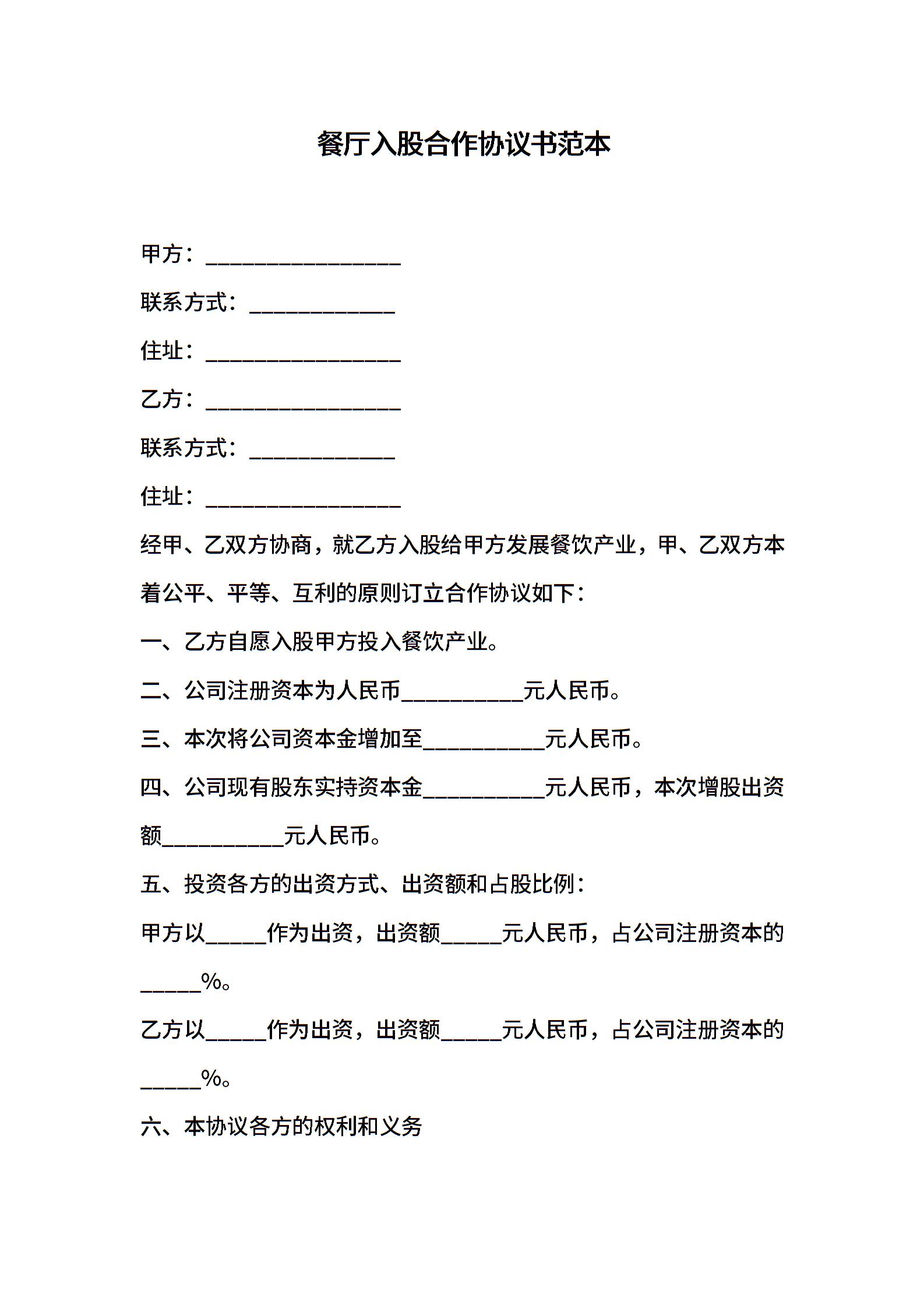 餐厅入股合作协议书范本