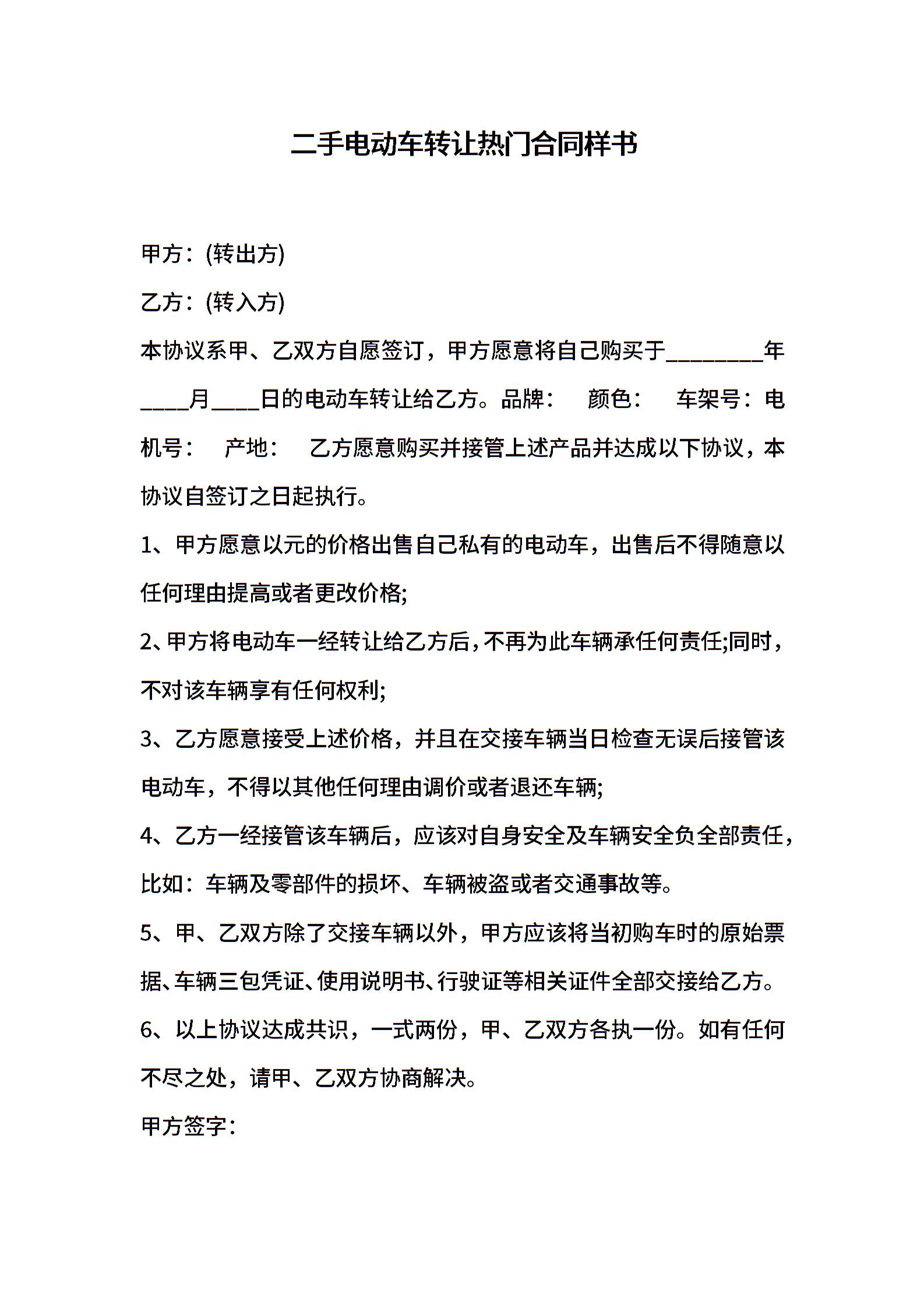 二手电动车转让热门合同样书