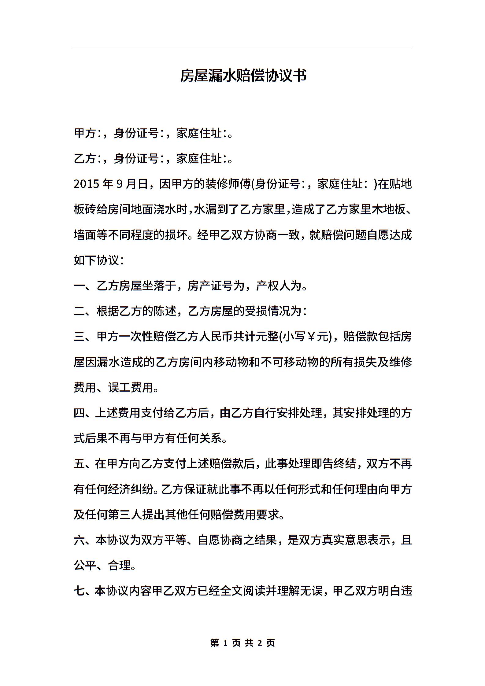 房屋漏水赔偿协议书