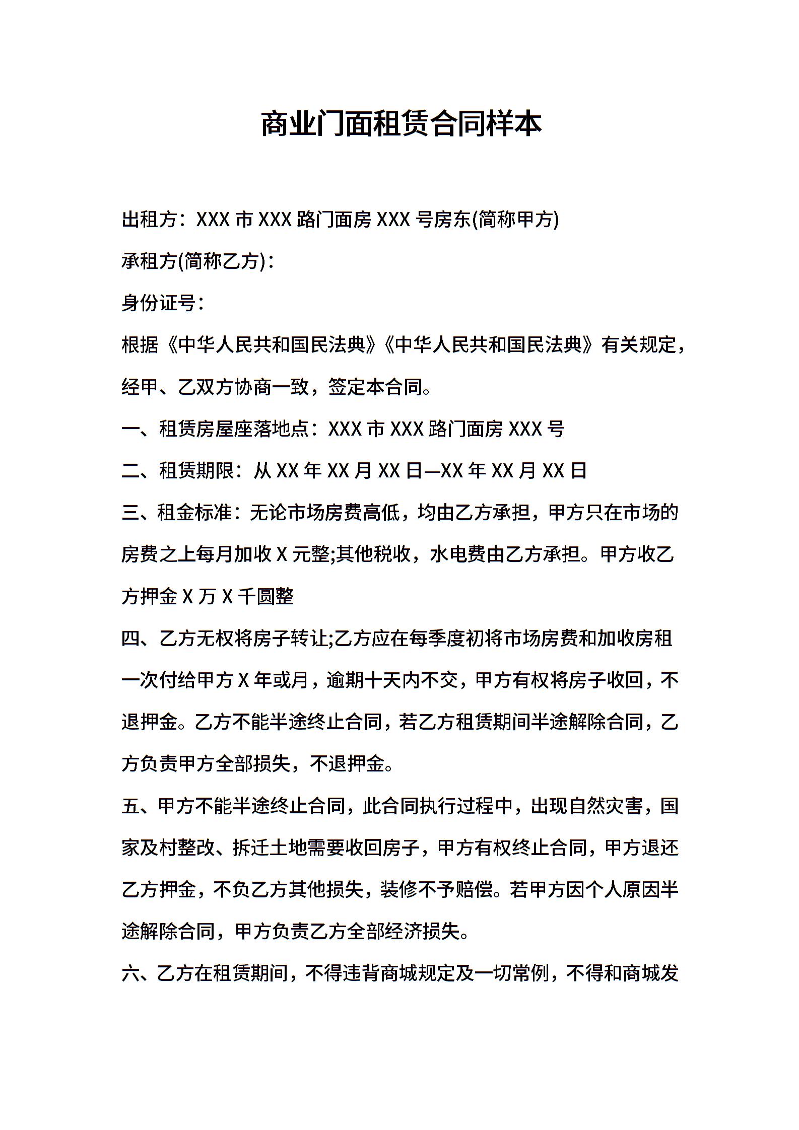 2021年商业门面租赁合同样本