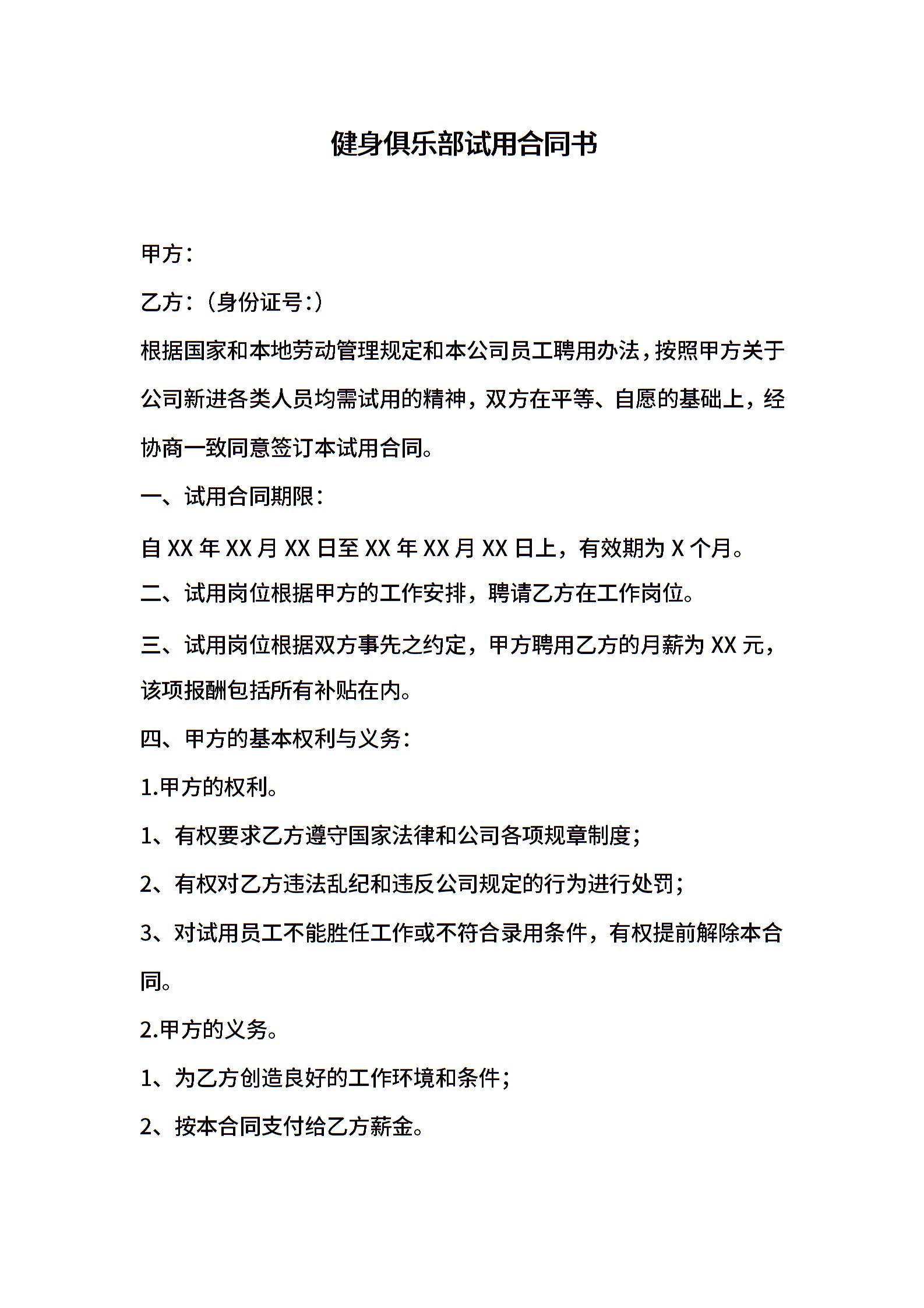健身俱乐部试用合同书