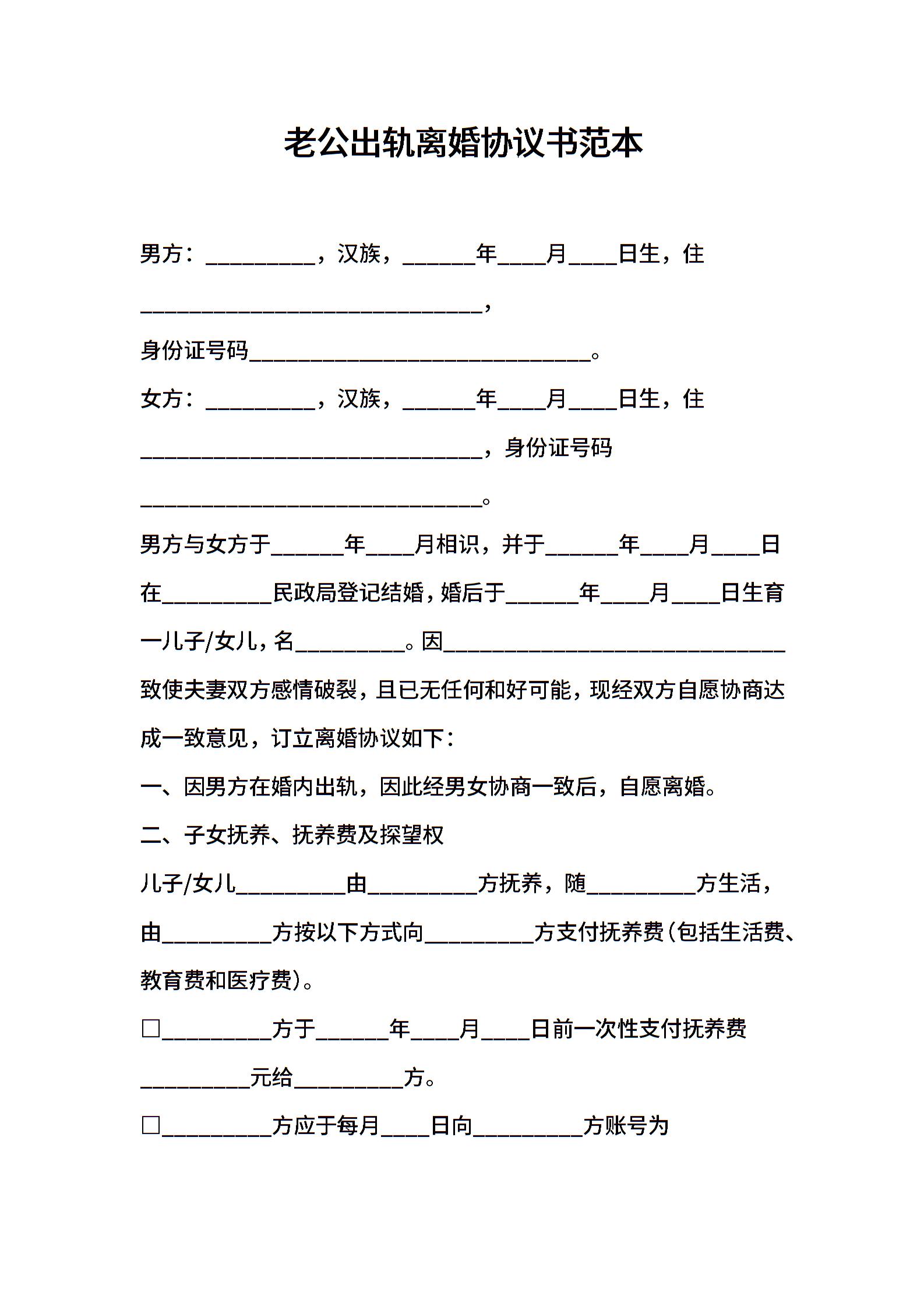 老公出轨离婚协议书范本