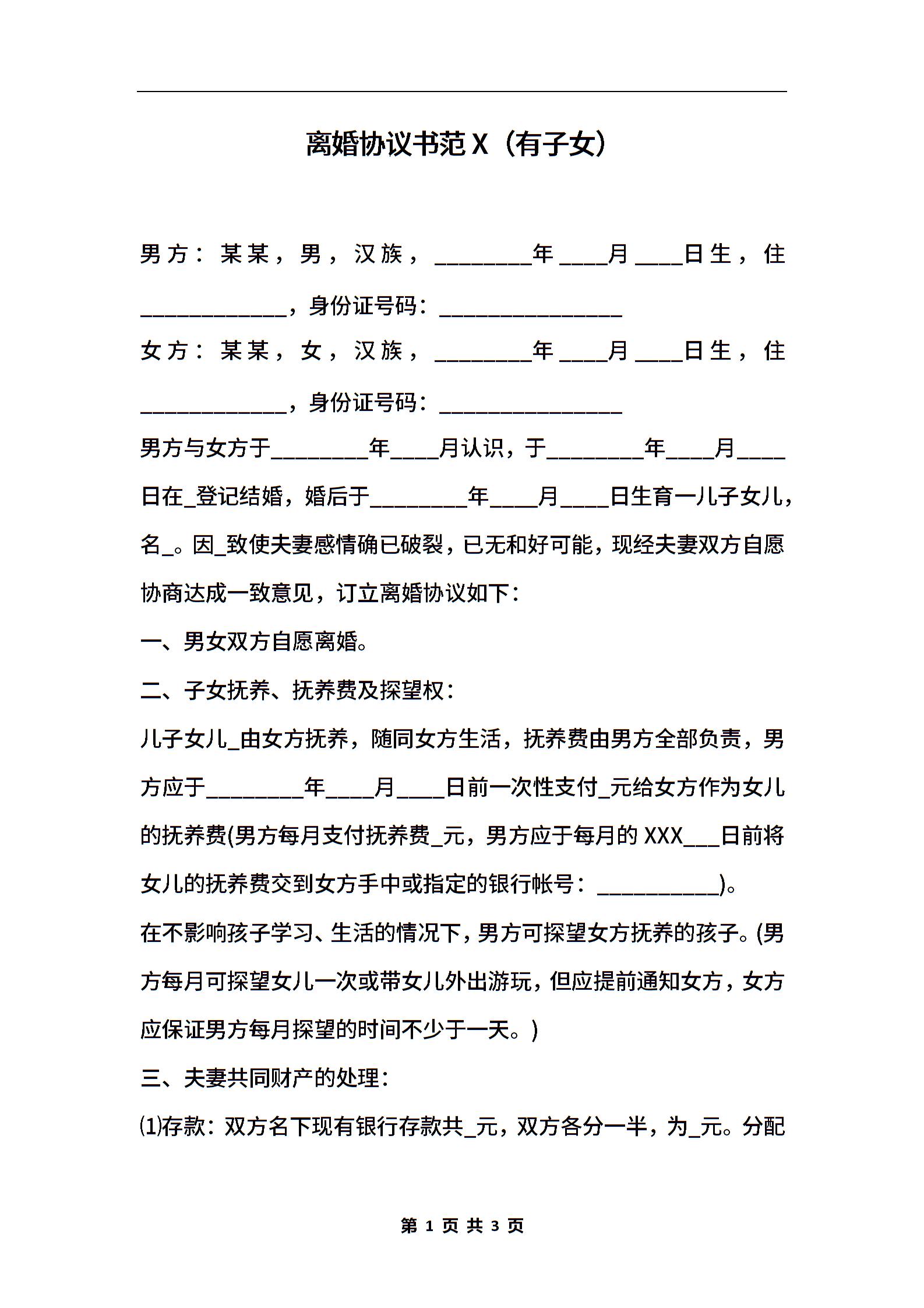 离婚协议书范X(有子女)