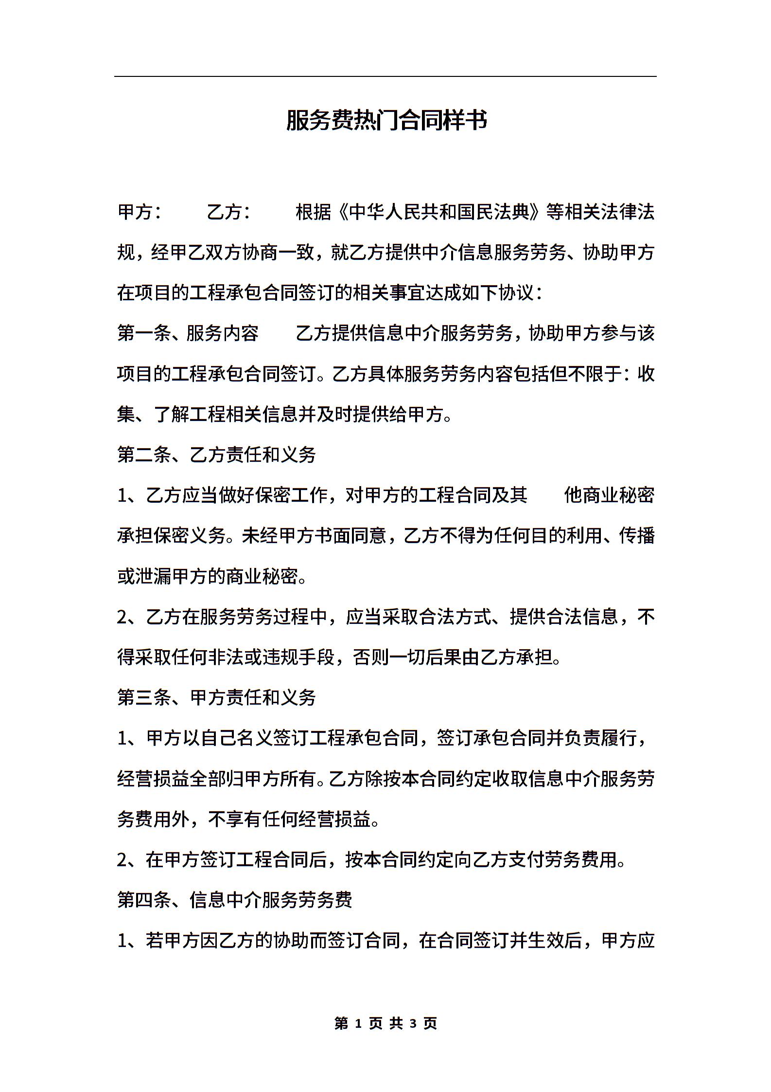 服务费热门合同样书