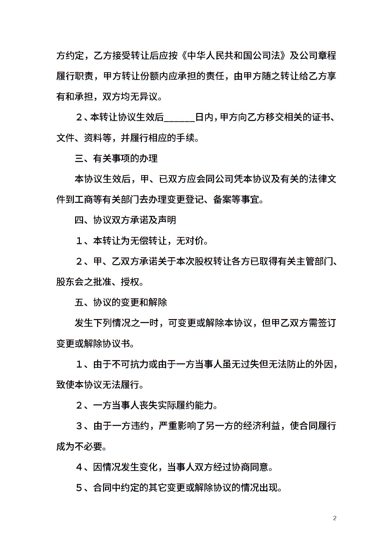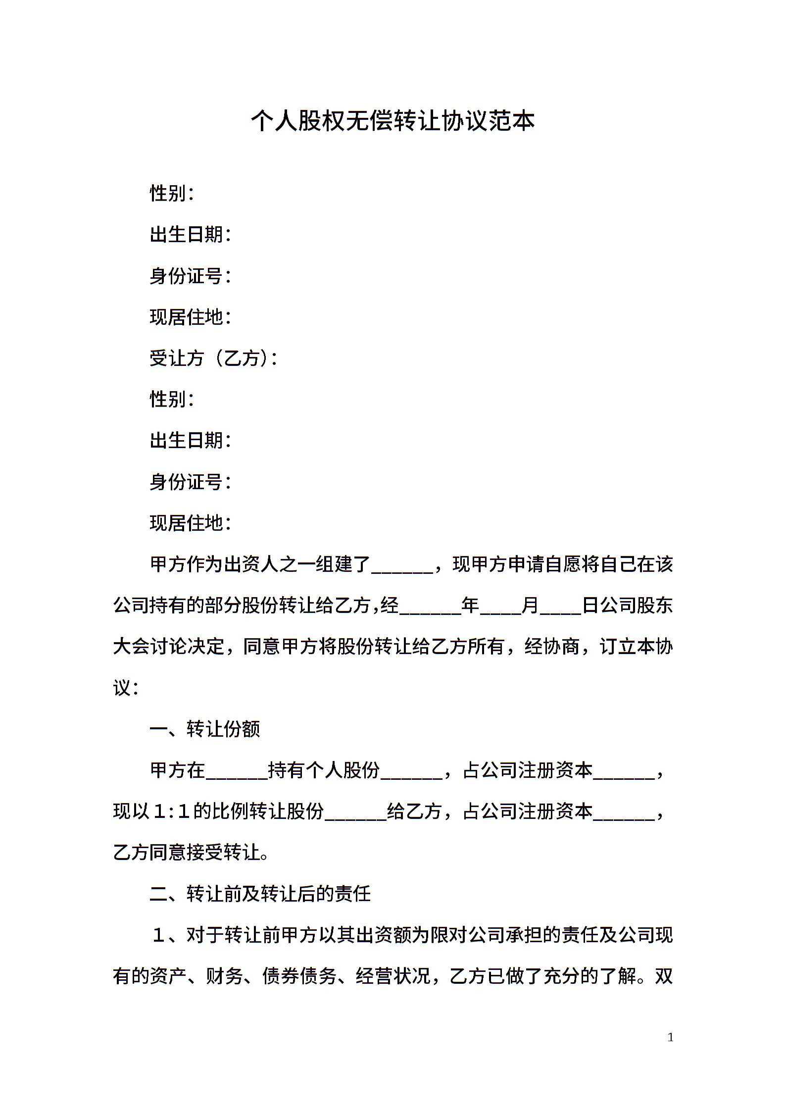 个人股权无偿转让协议范本