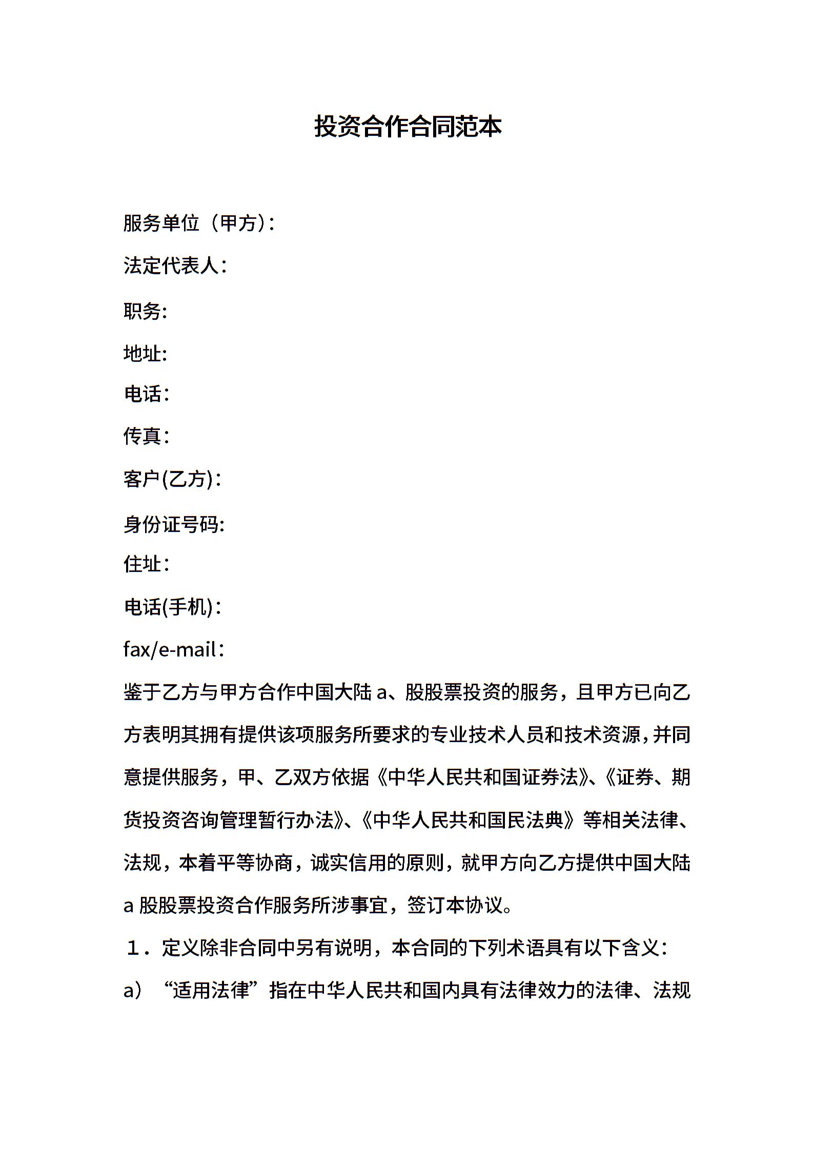 投资合作合同范本