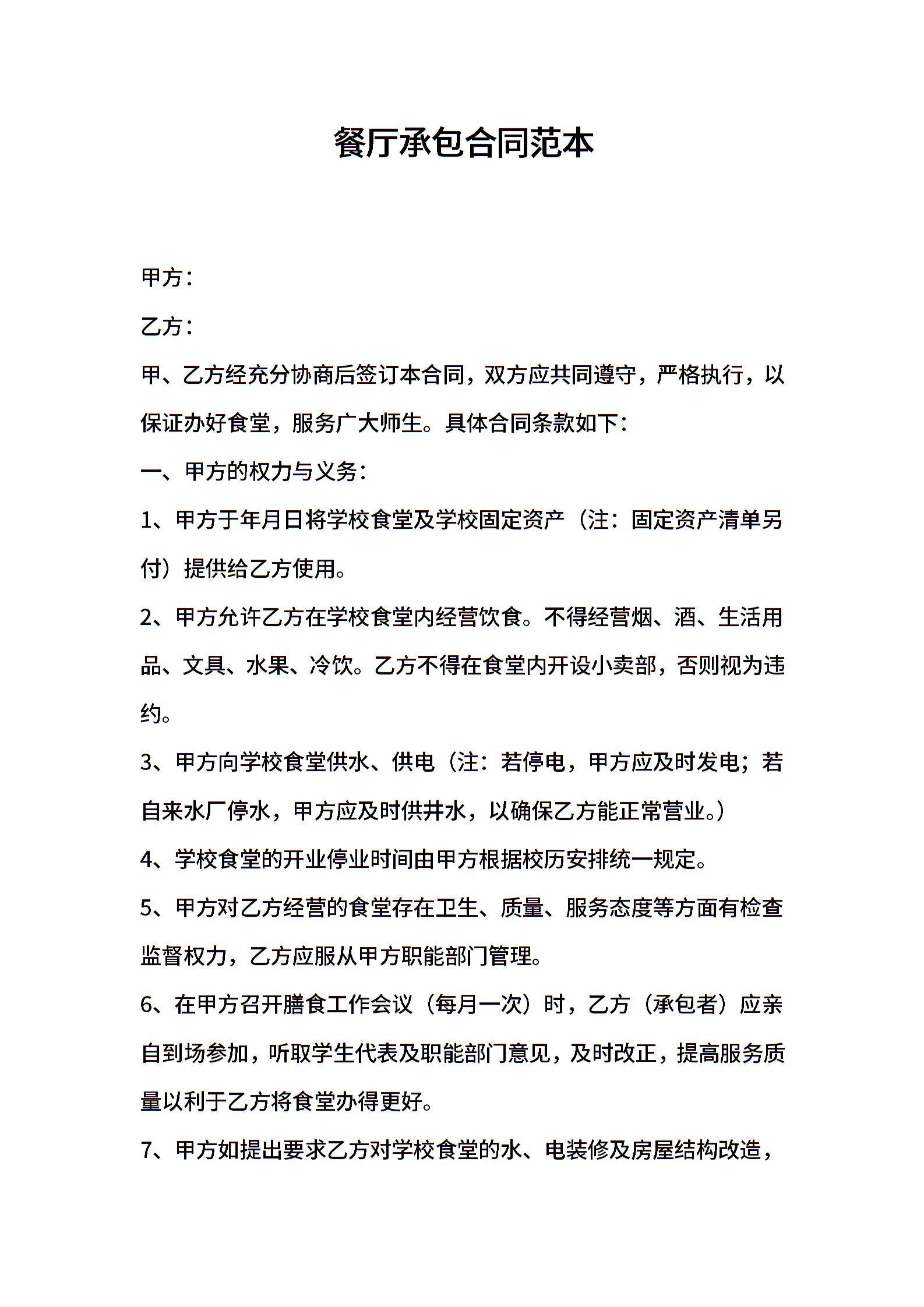 2021年餐厅承包合同范本