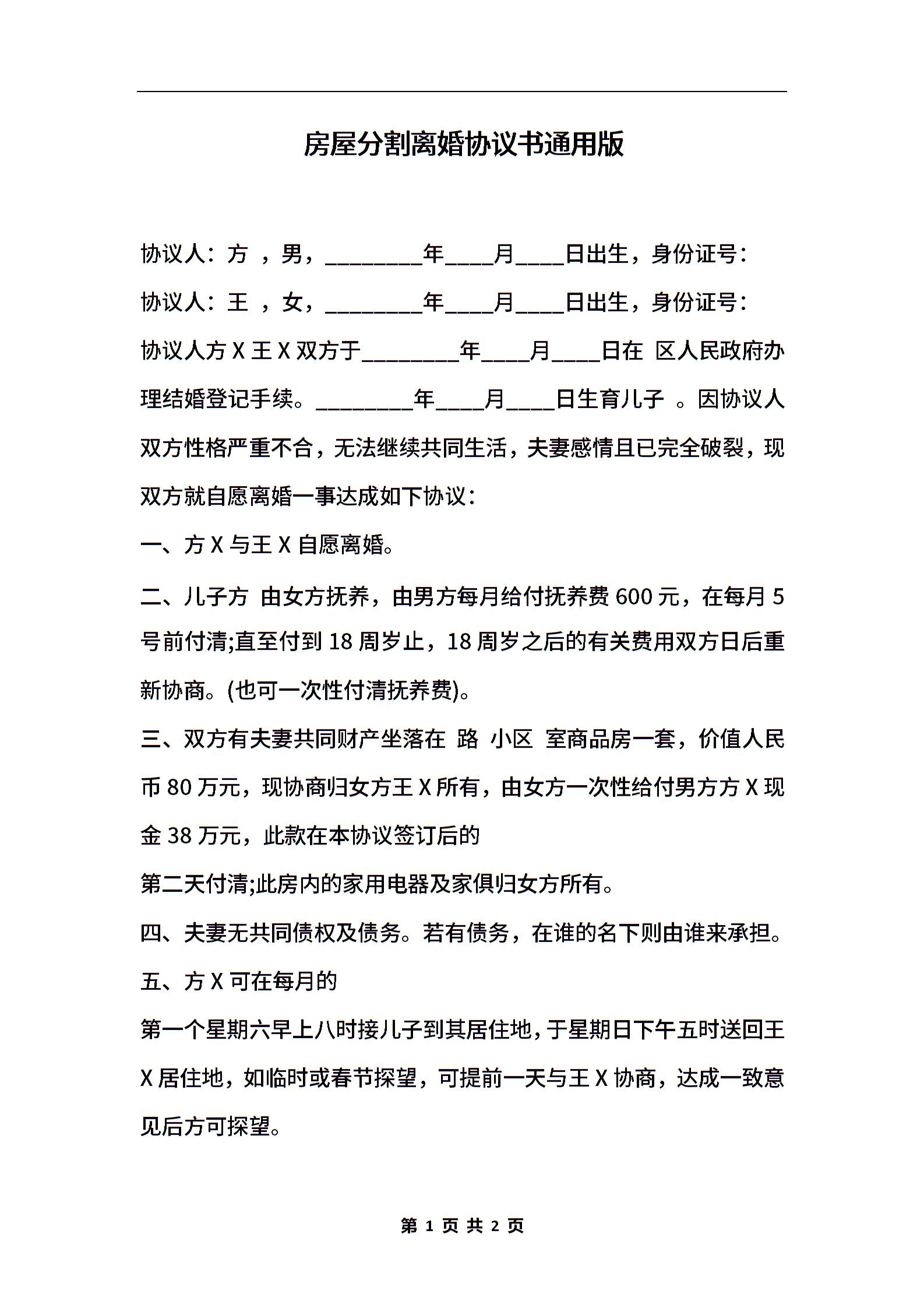 房屋分割离婚协议书通用版