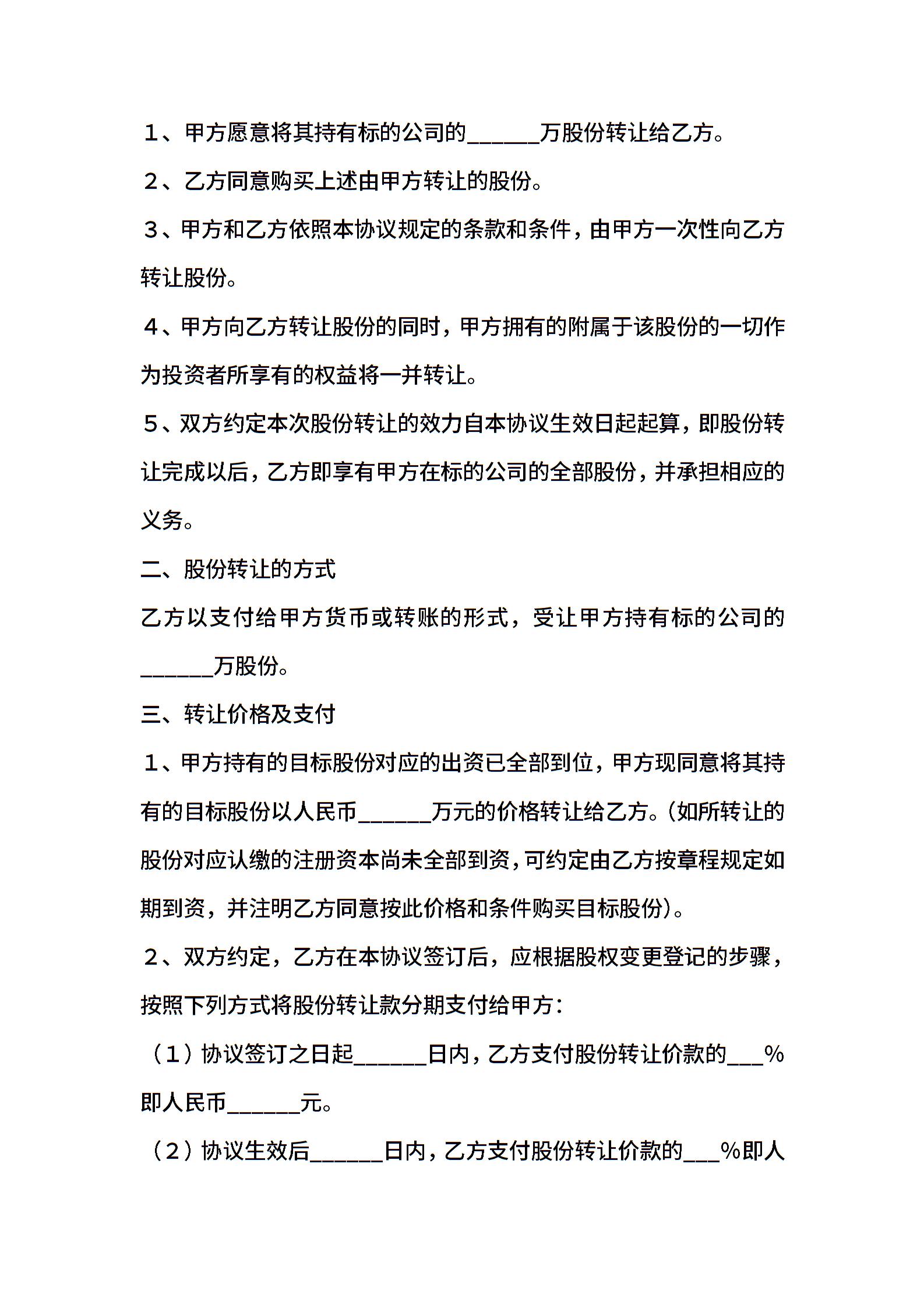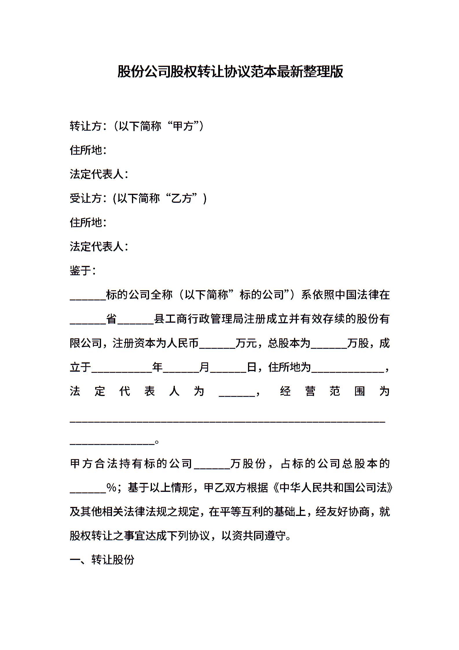 股份公司股权转让协议范本最新整理版