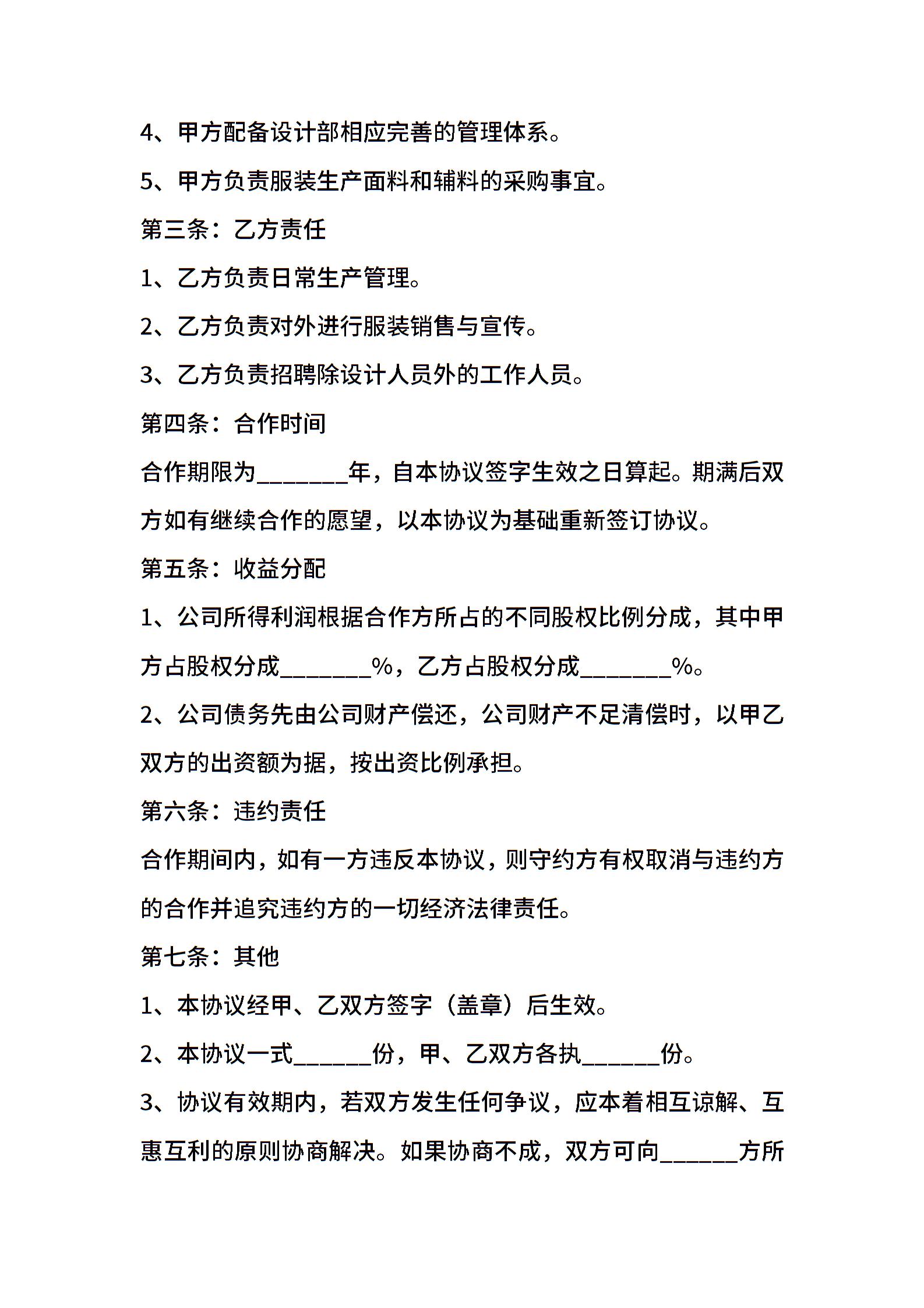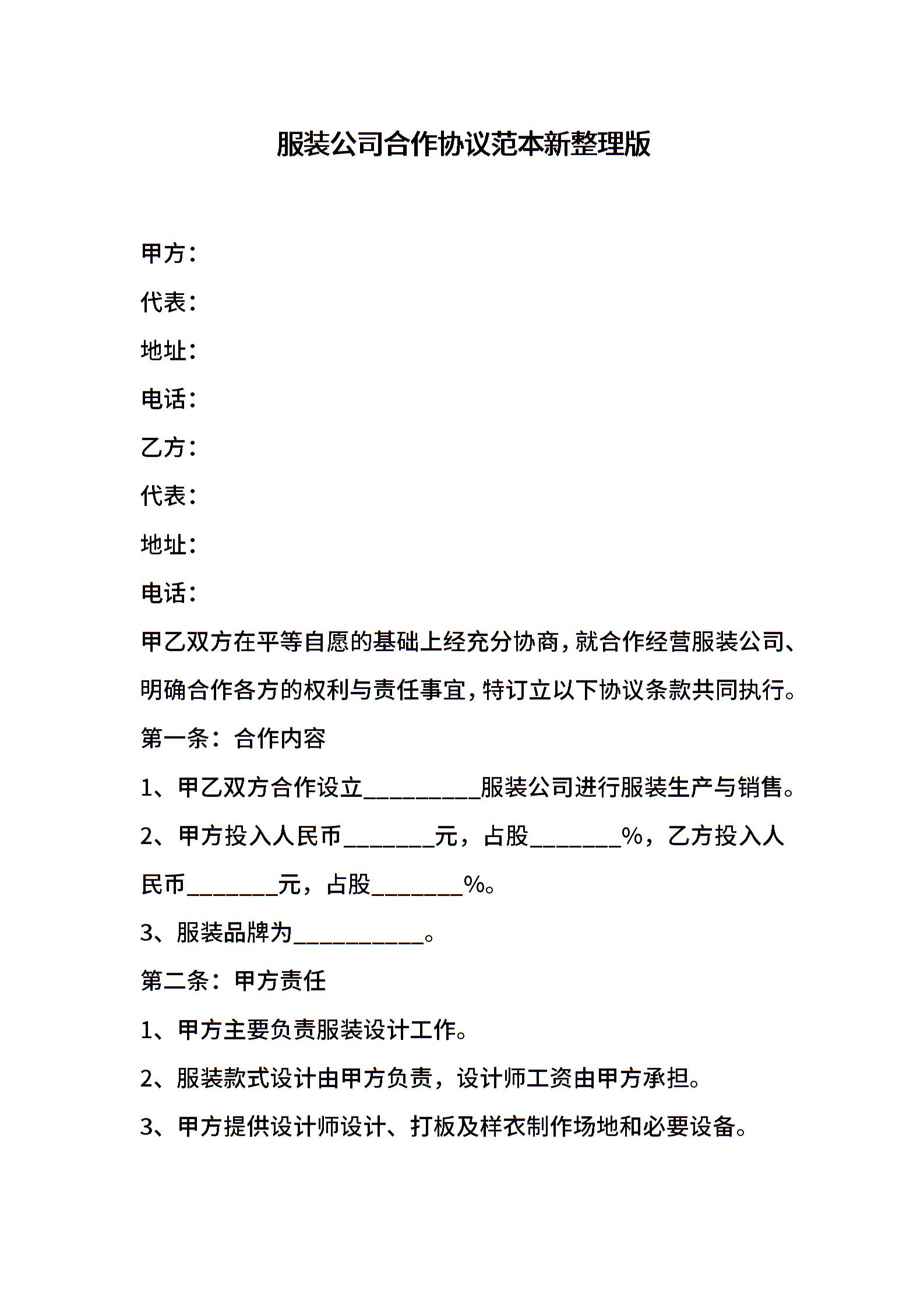 服装公司合作协议范本新整理版