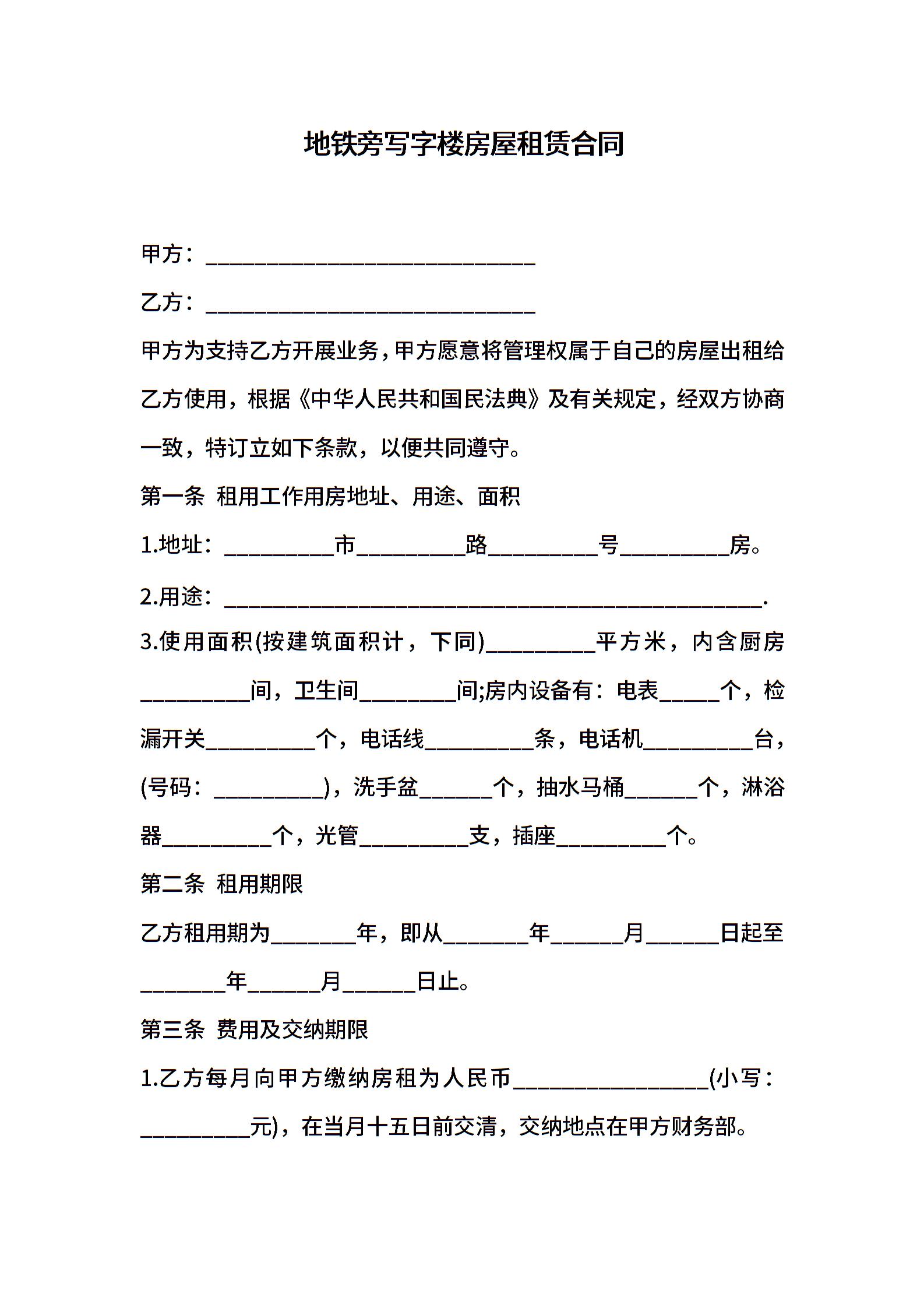 地铁旁写字楼房屋租赁合同