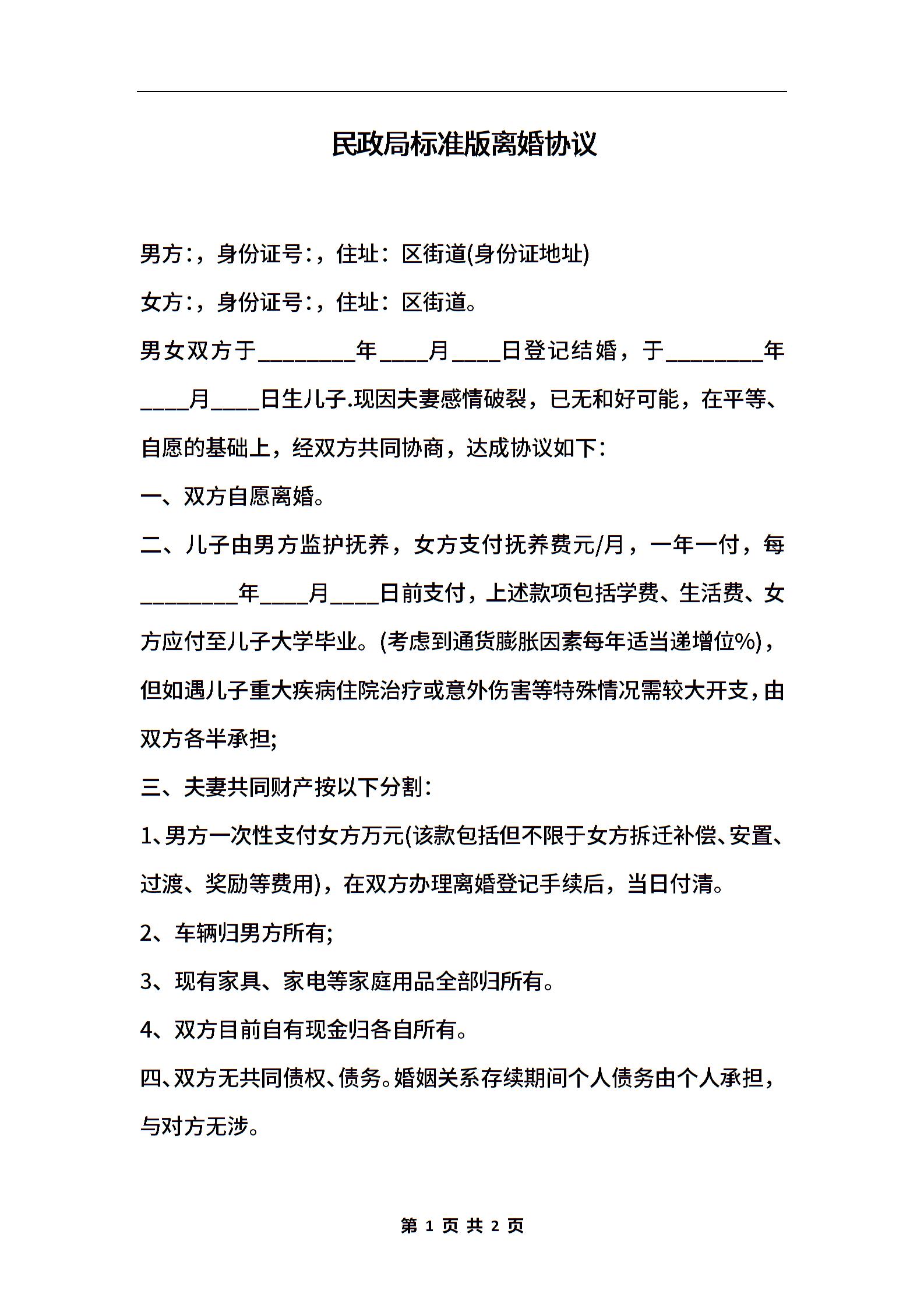 民政局标准版离婚协议