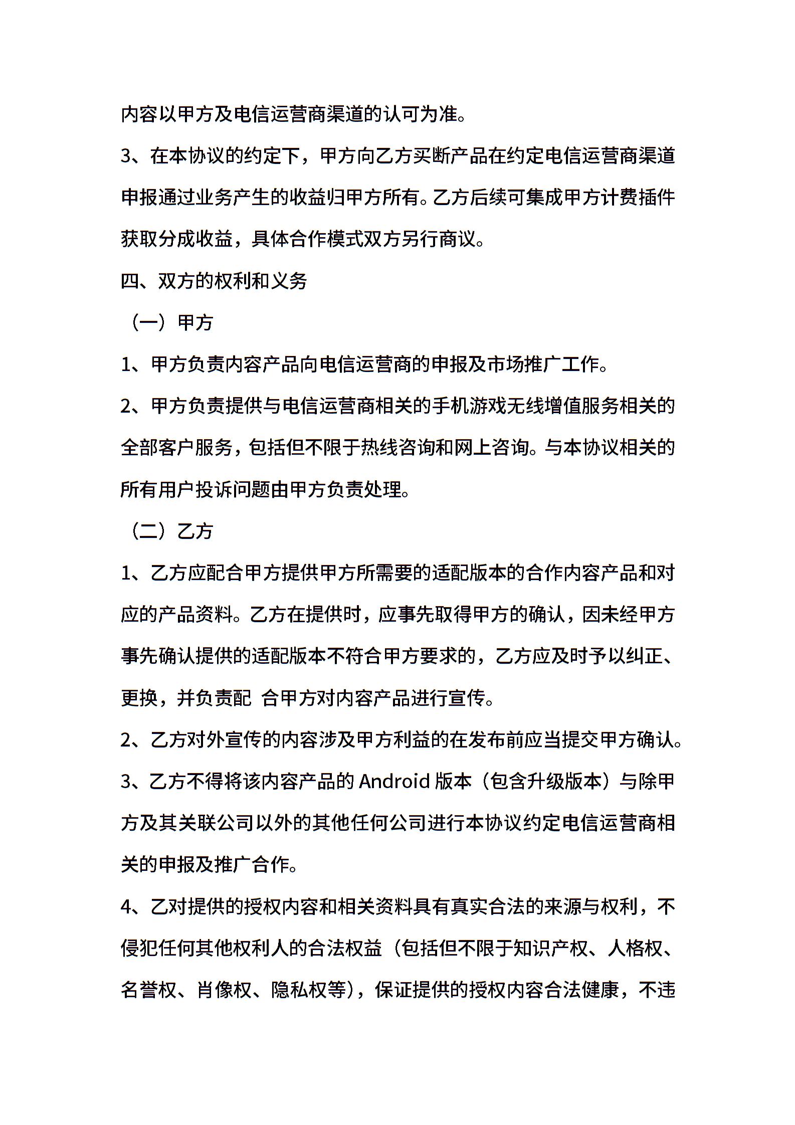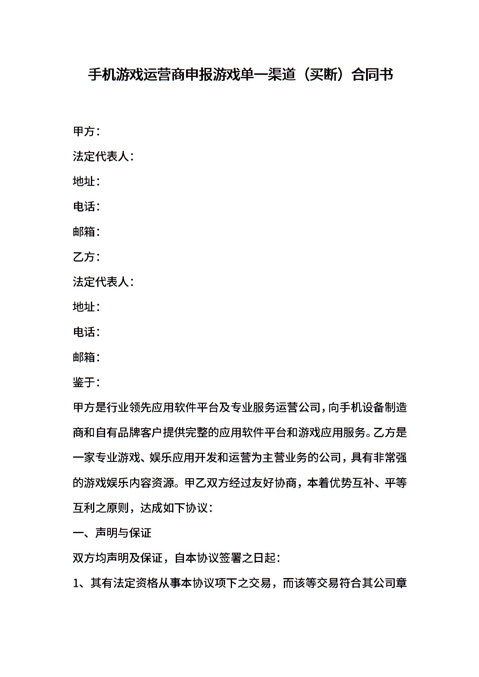 手机游戏运营商申报游戏单一渠道(买断)合同书