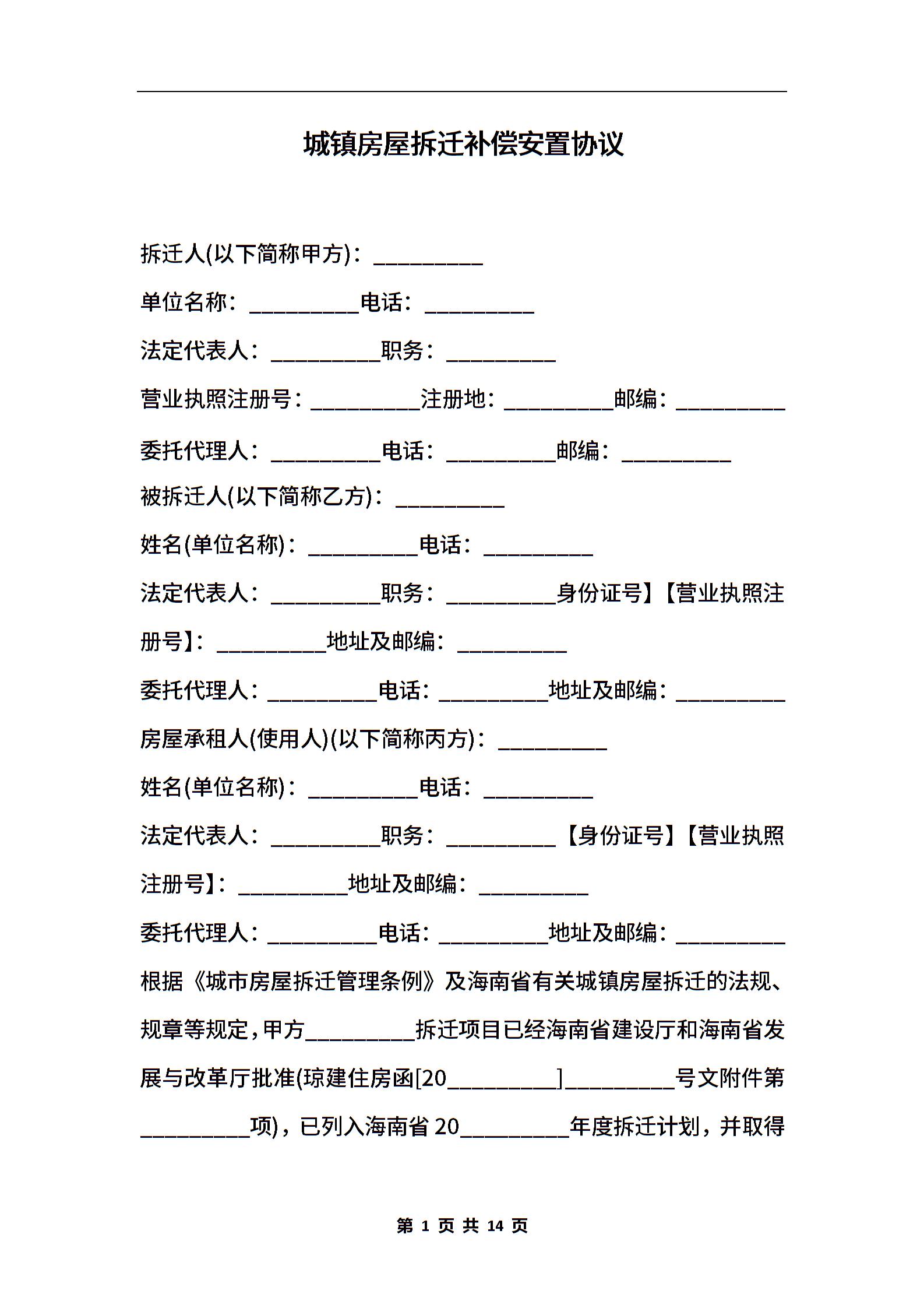 城镇房屋拆迁补偿安置协议