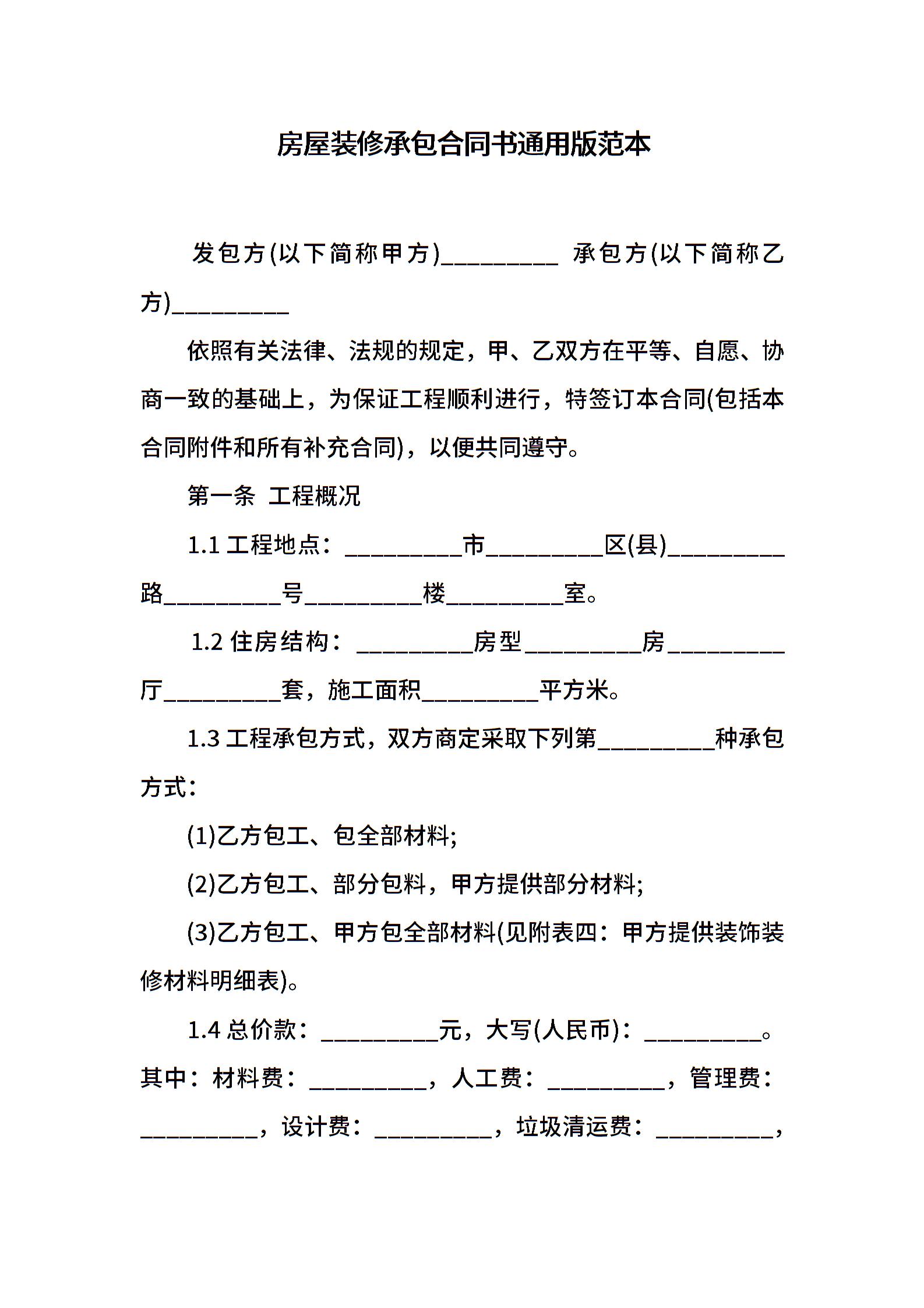 房屋装修承包合同书通用版范本