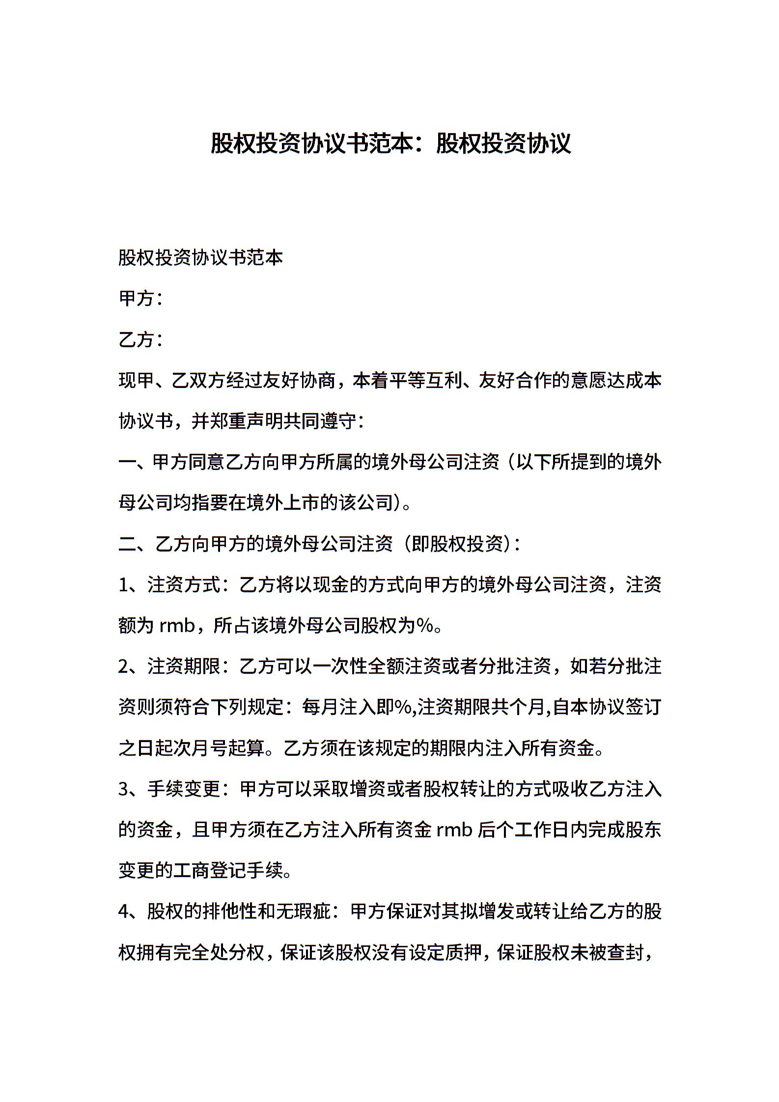 股权投资协议书范本:股权投资协议