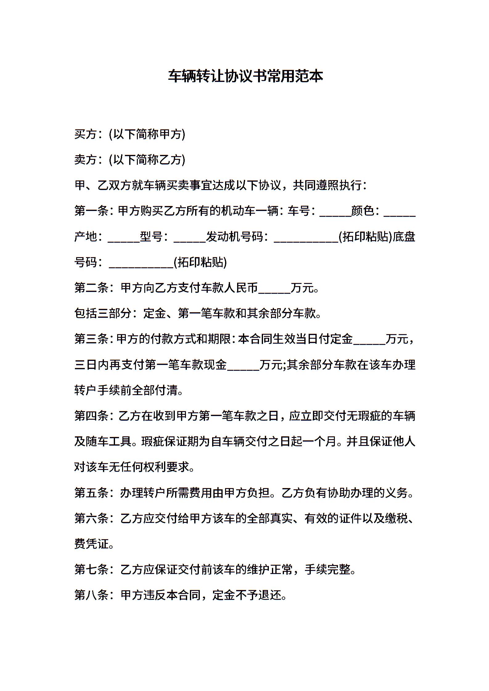 车辆转让协议书常用范本