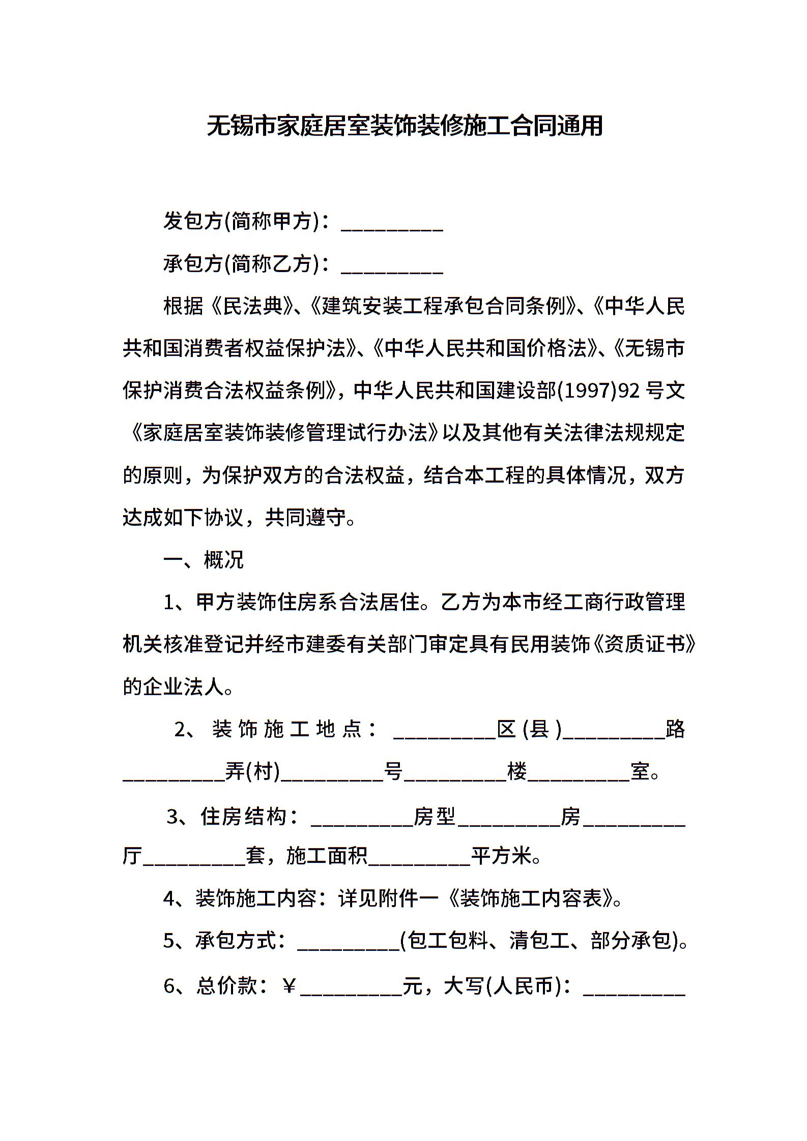 无锡市家庭居室装饰装修施工合同通用