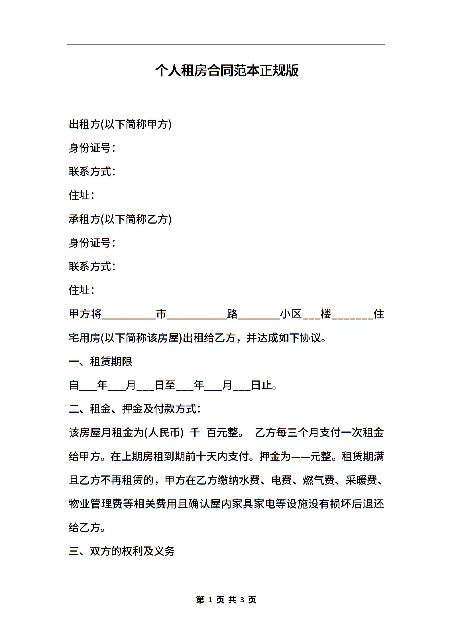 个人租房合同范本正规版