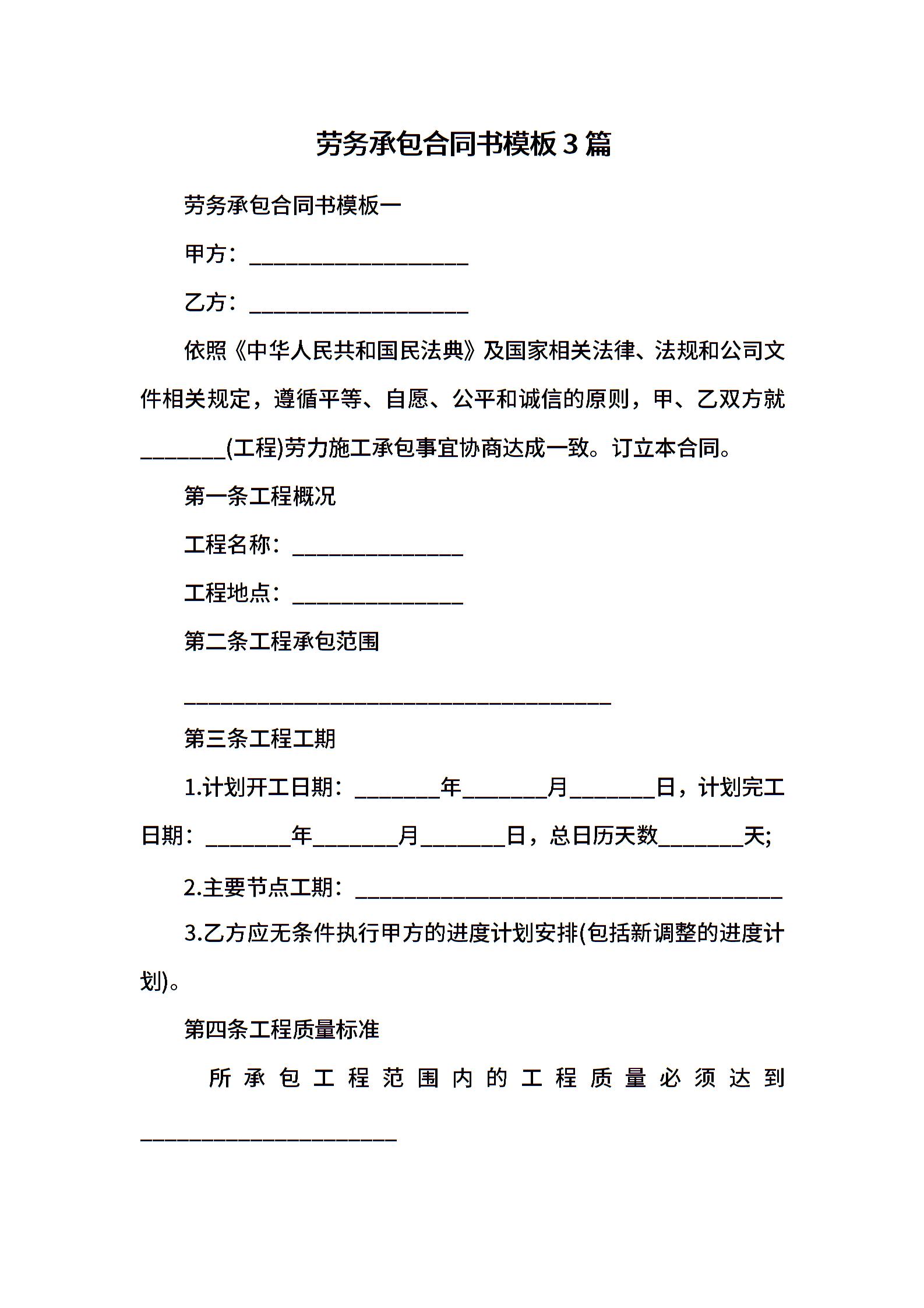 劳务承包合同书模板3篇