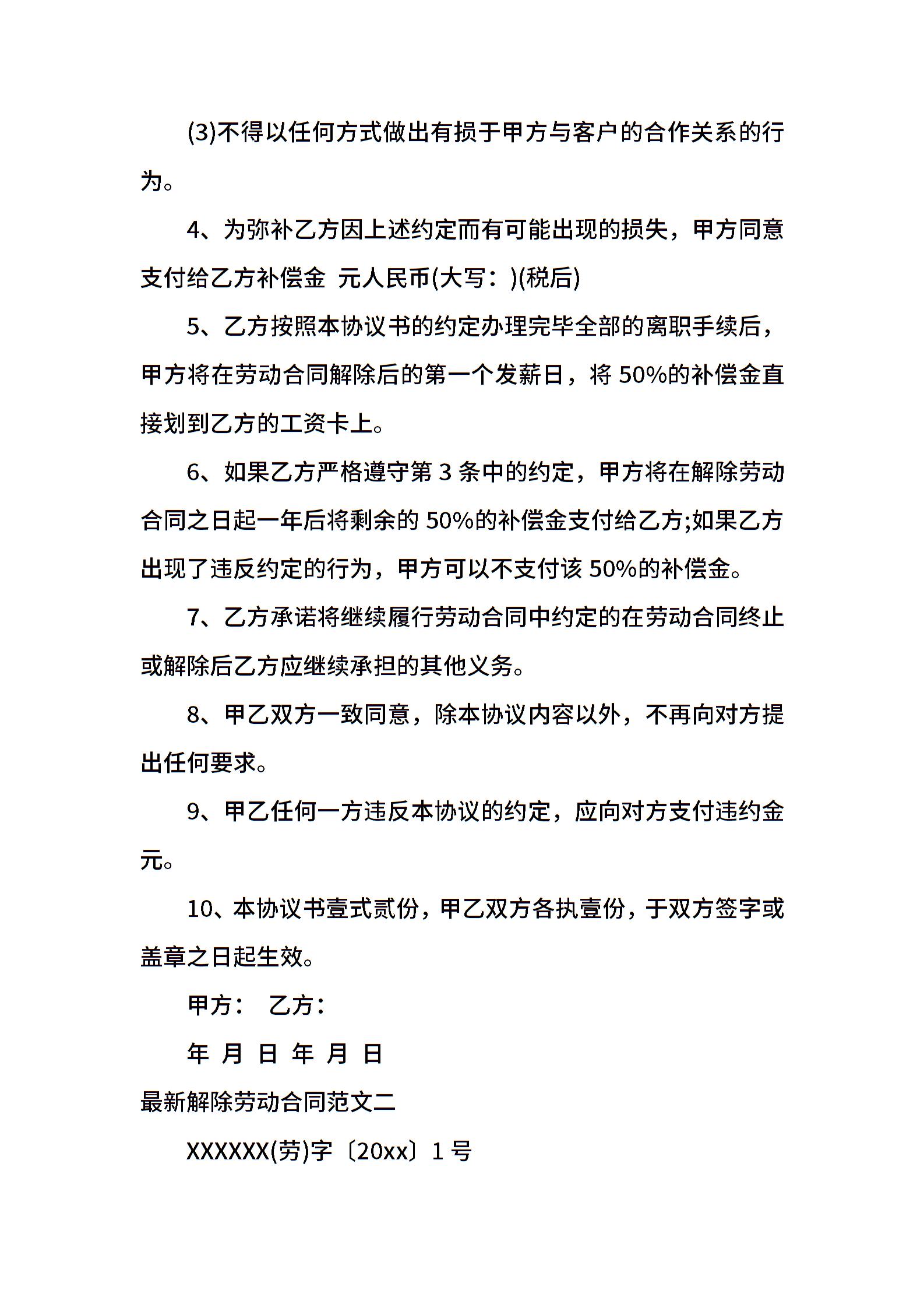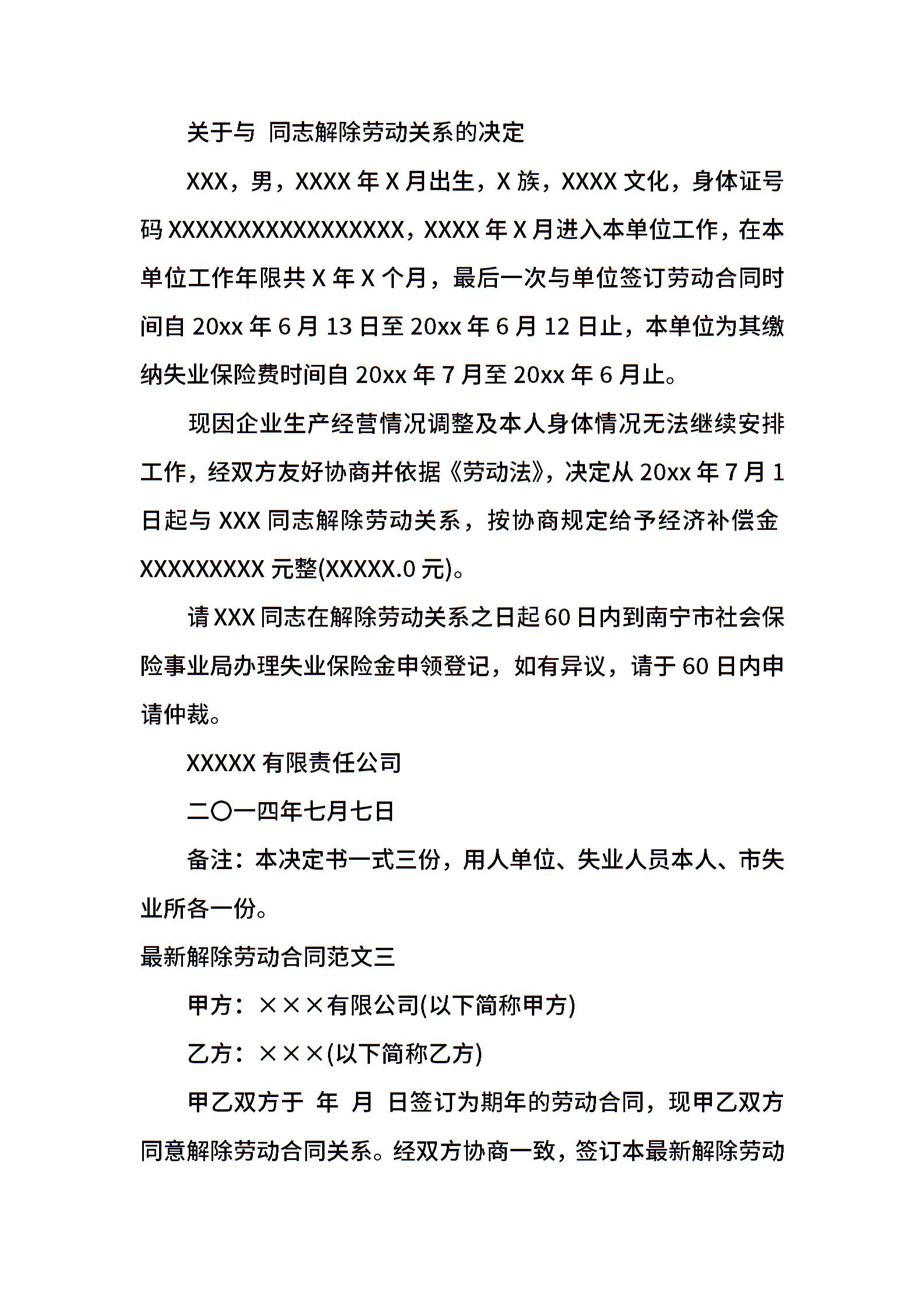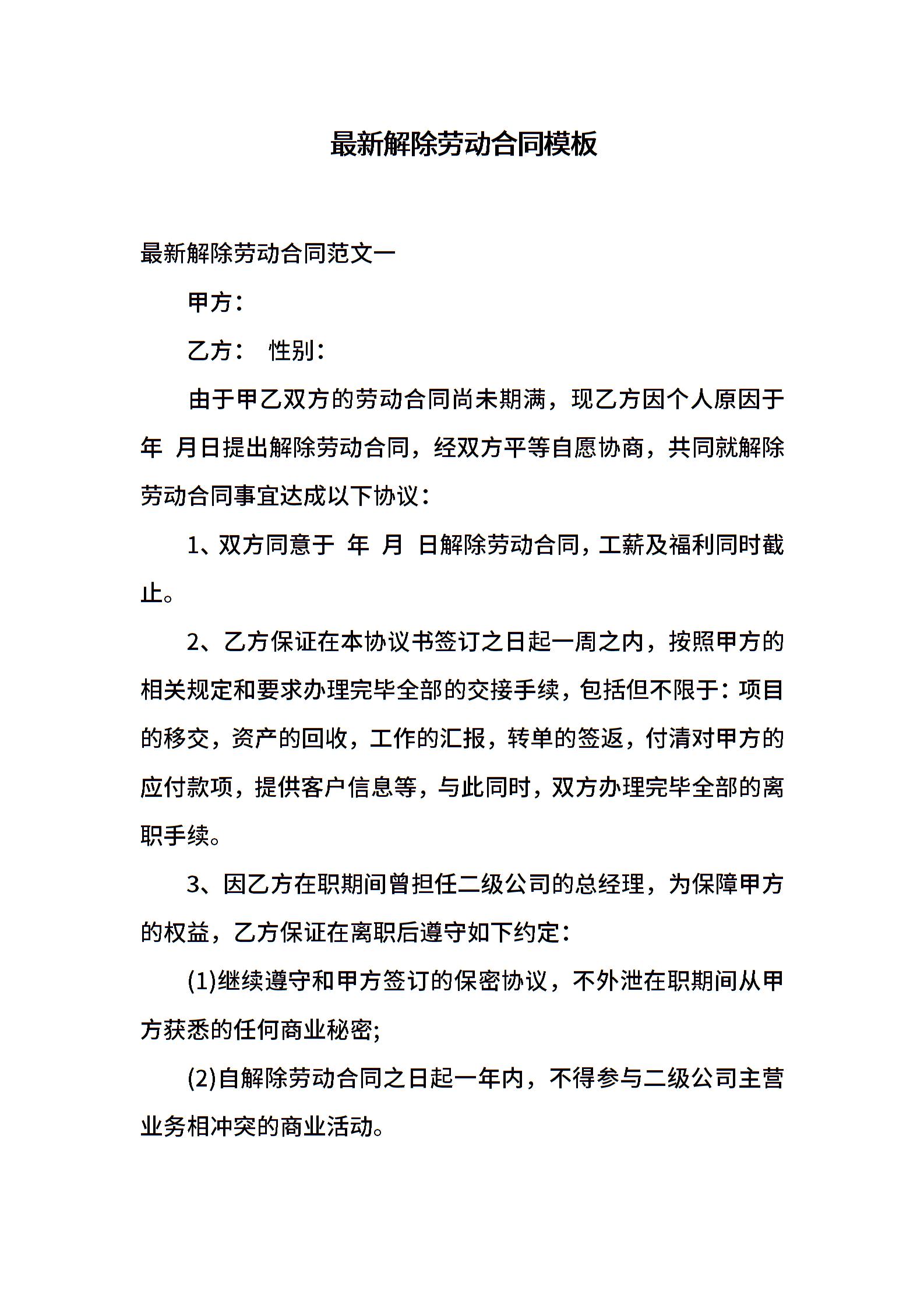 最新解除劳动合同模板