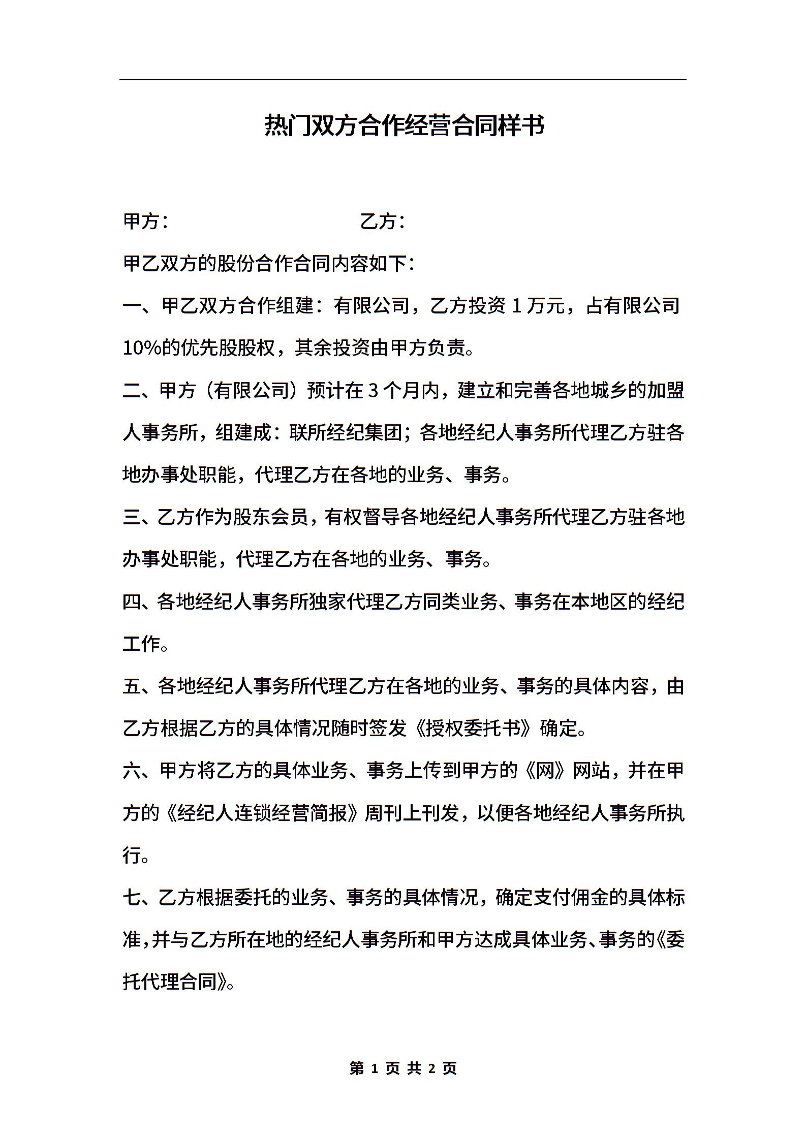 热门双方合作经营合同样书