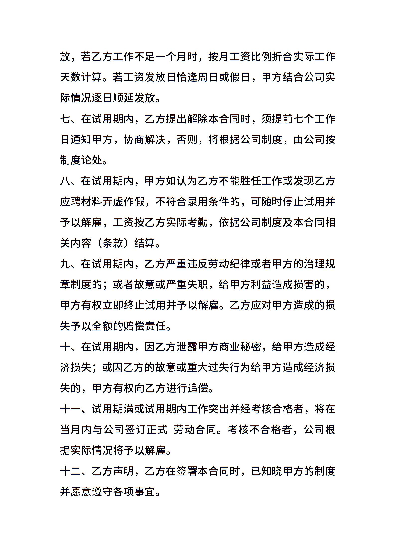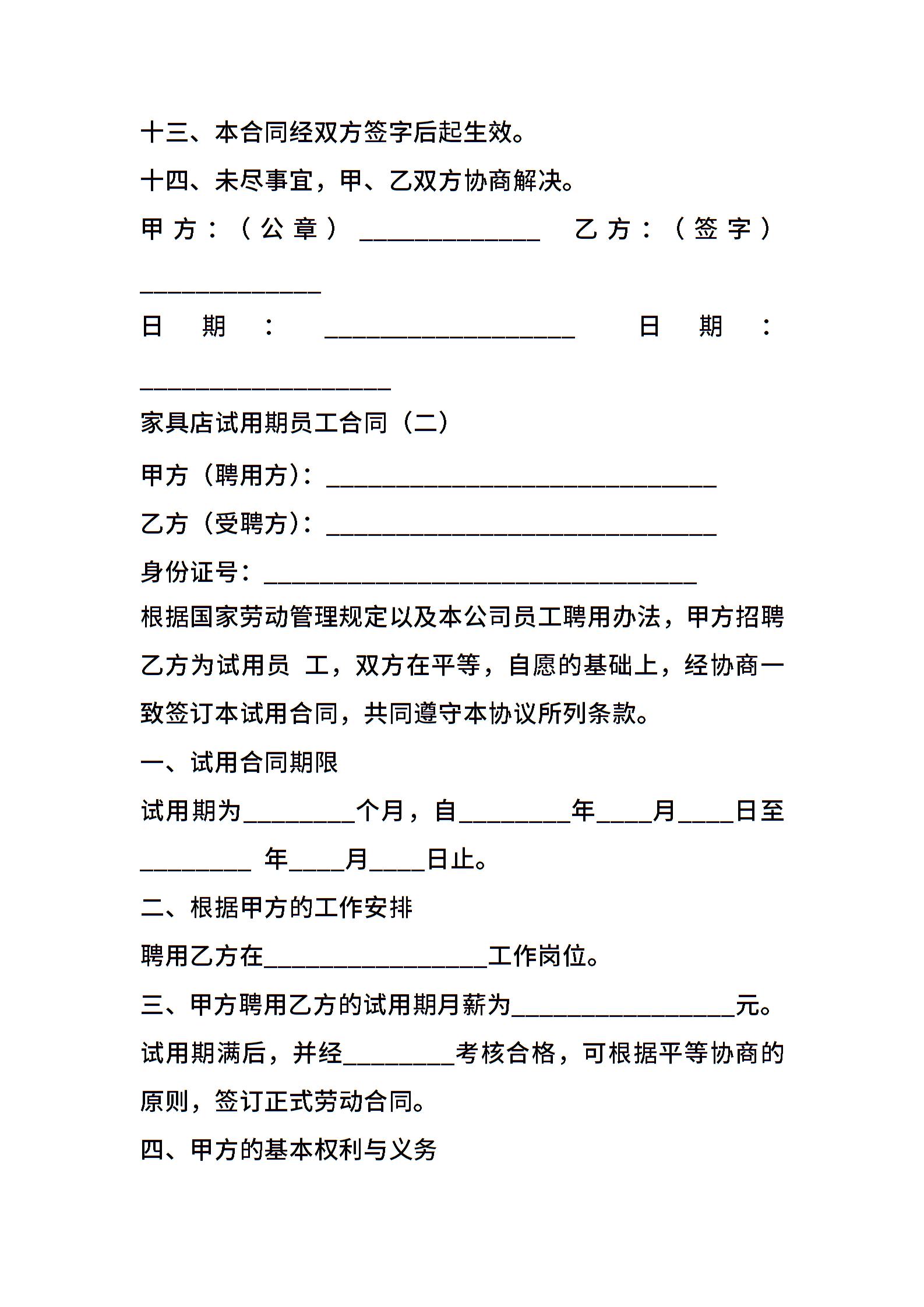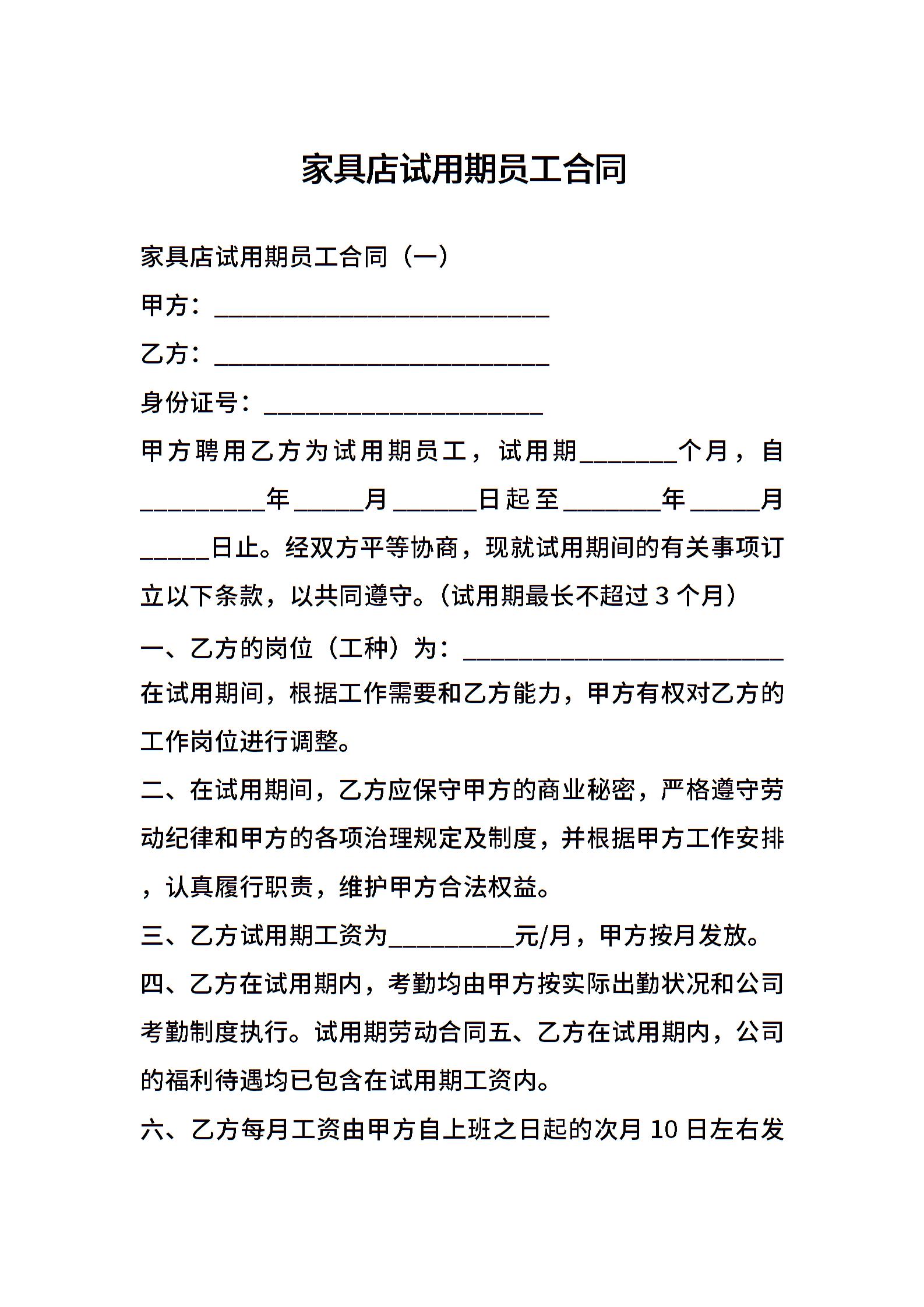 家具店试用期员工合同
