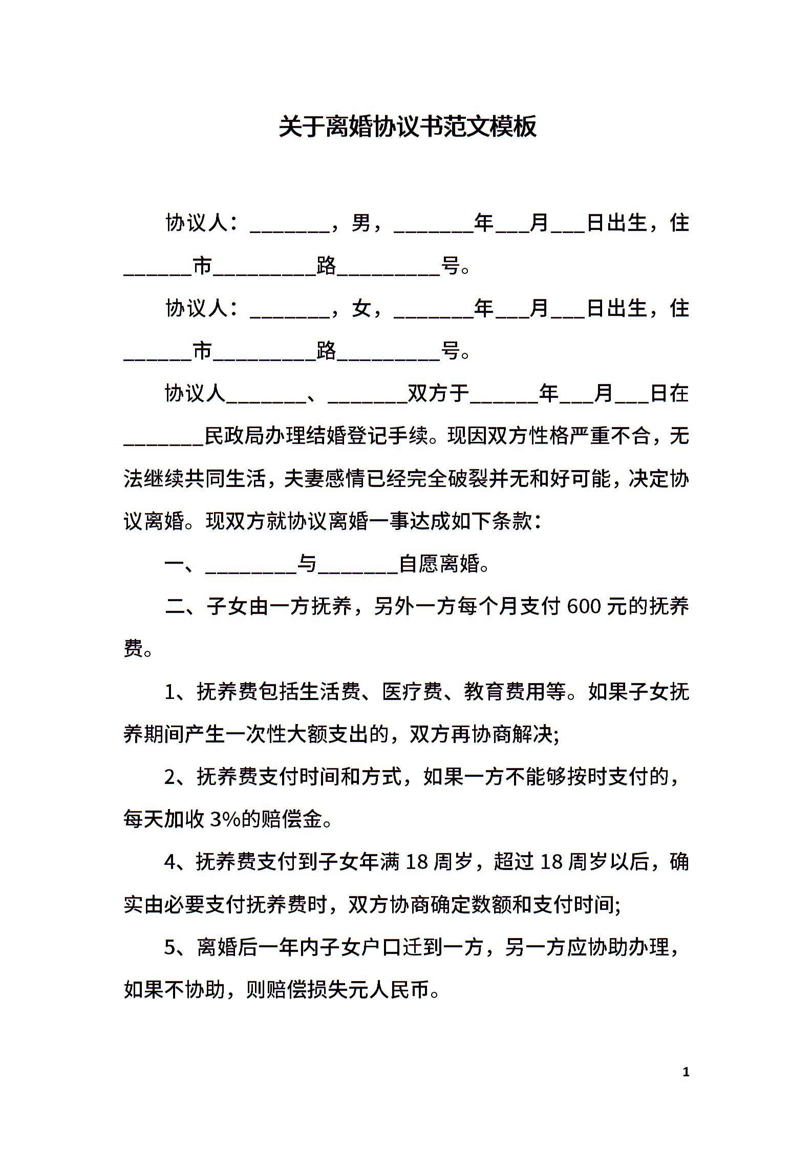 关于离婚协议书范文模板