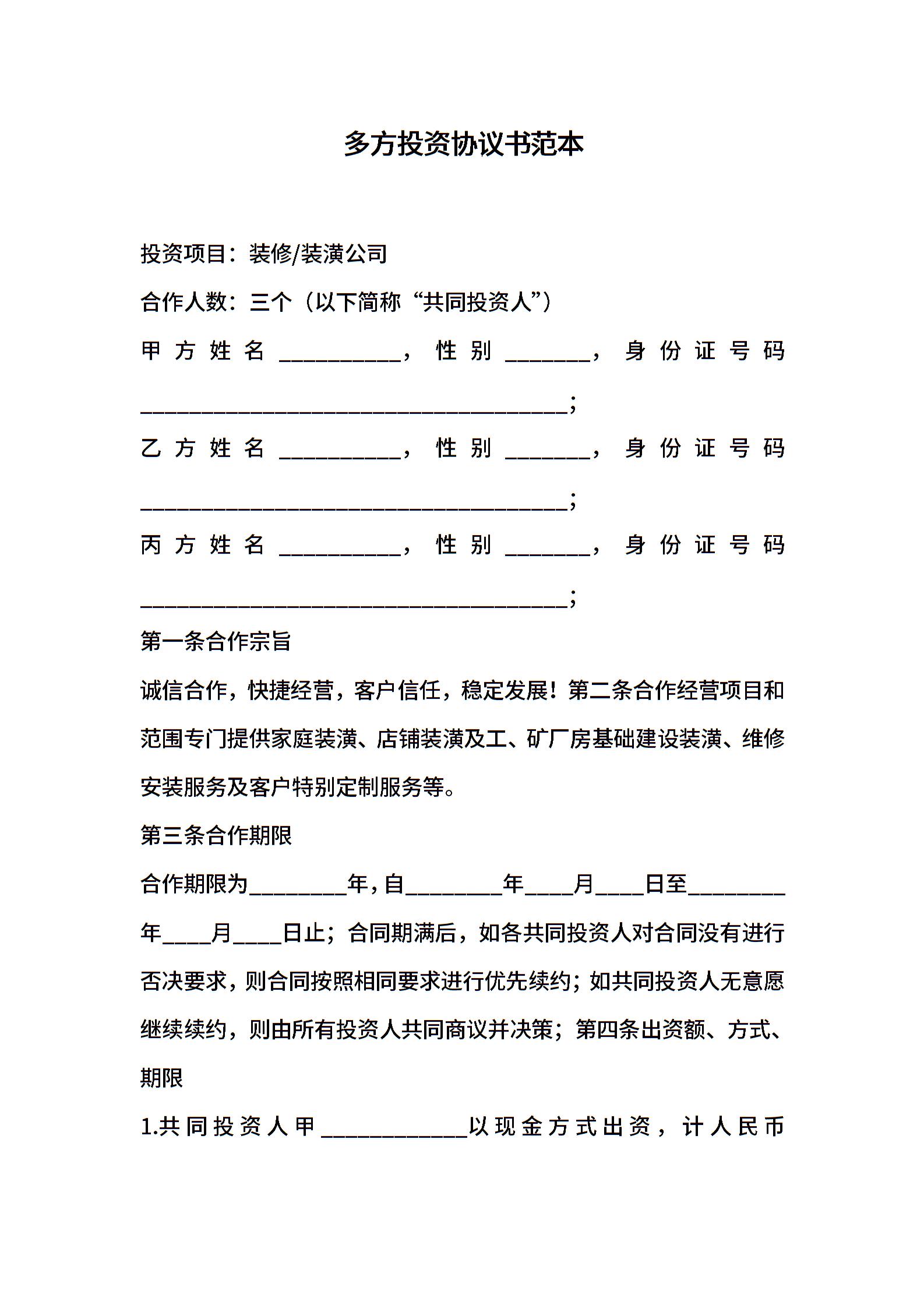 多方投资协议书范本