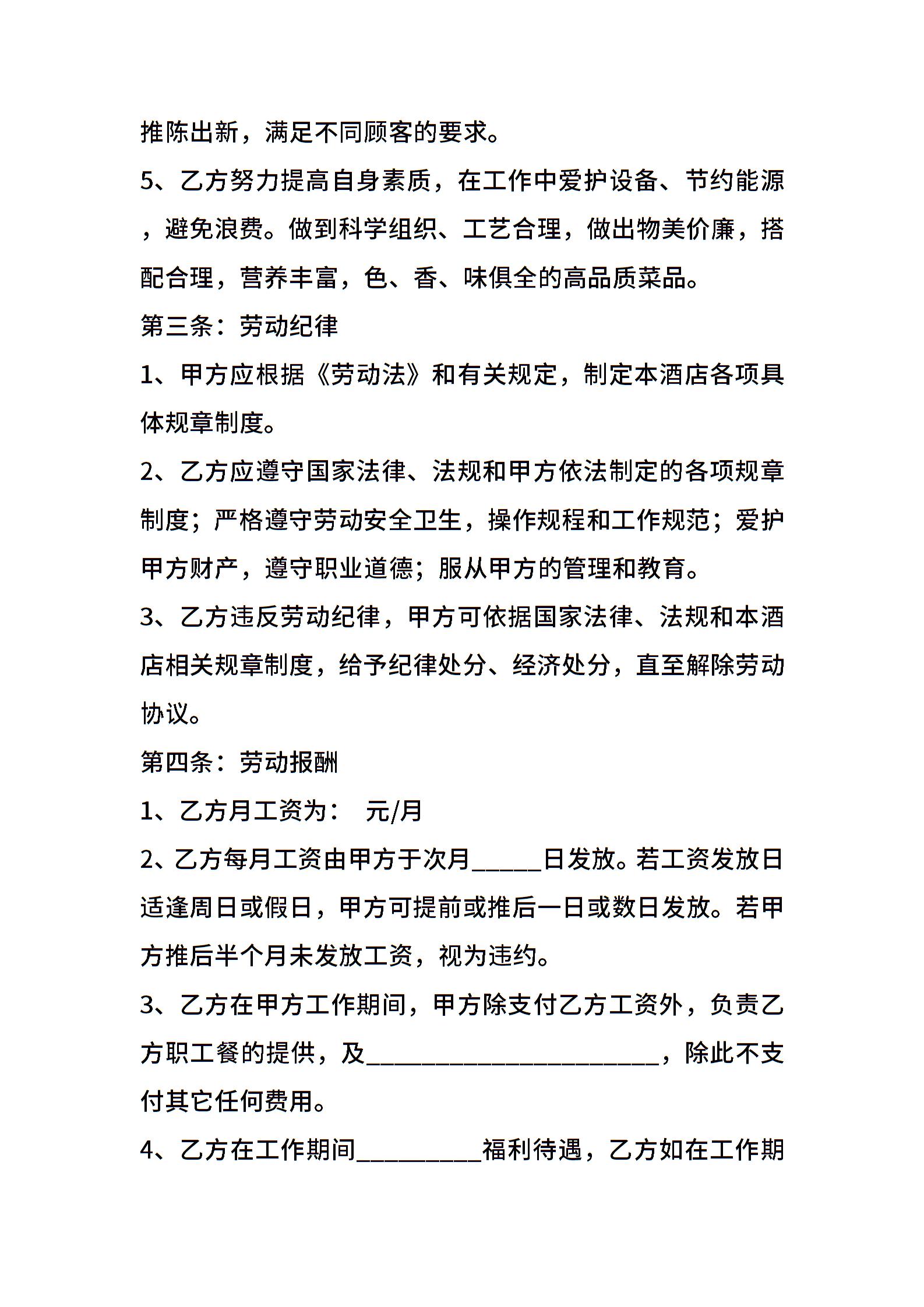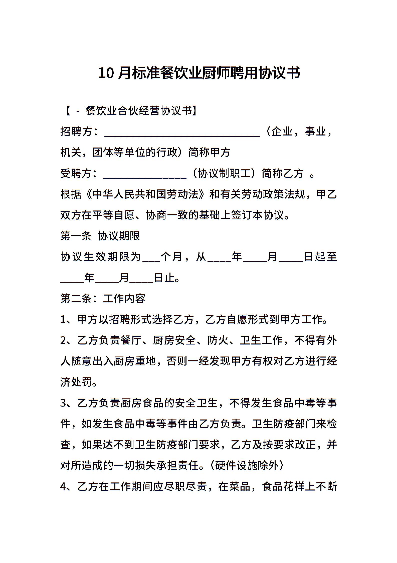 10月标准餐饮业厨师聘用协议书