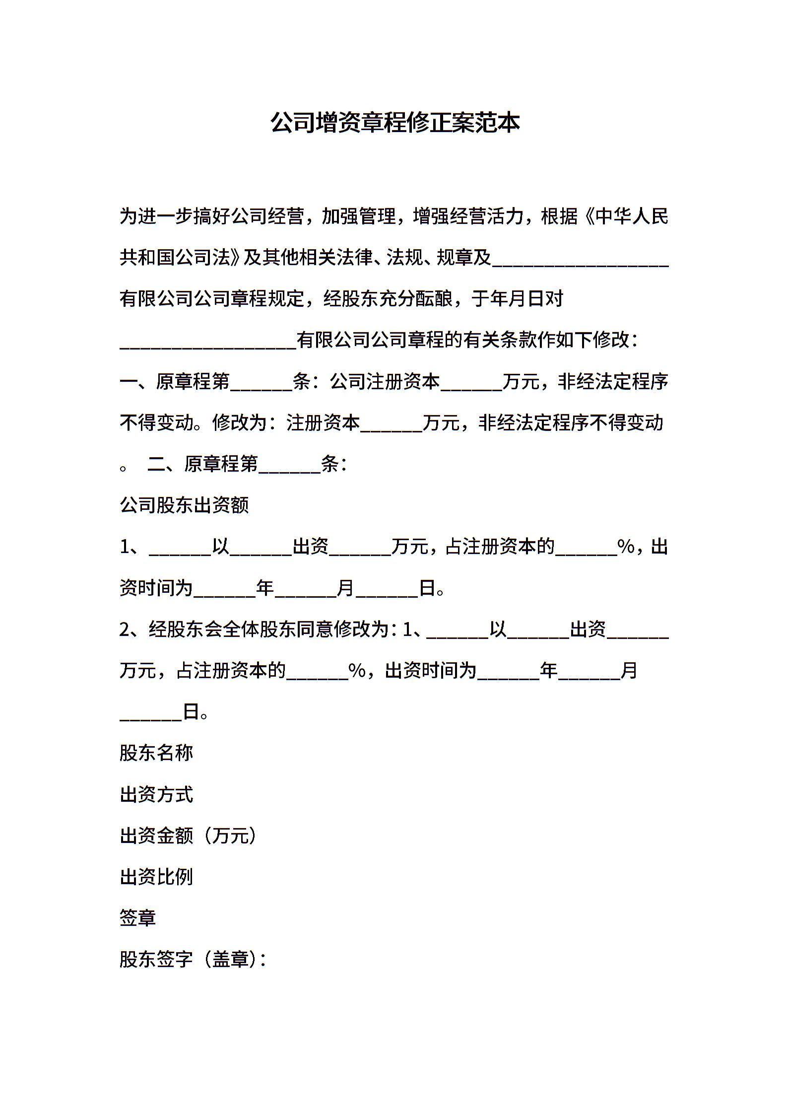 公司增资章程修正案范本