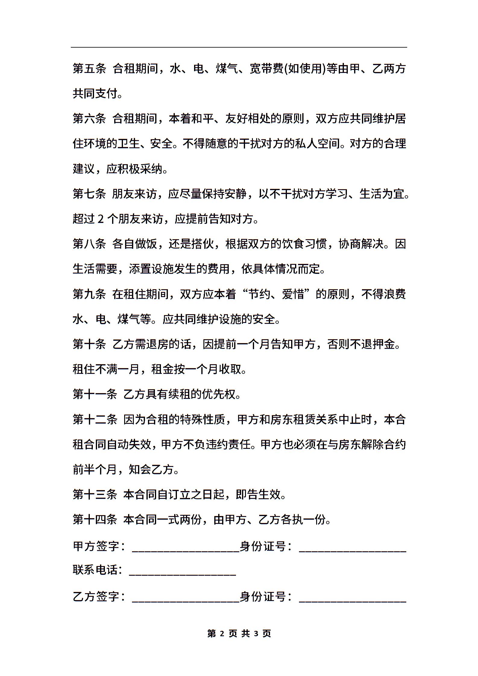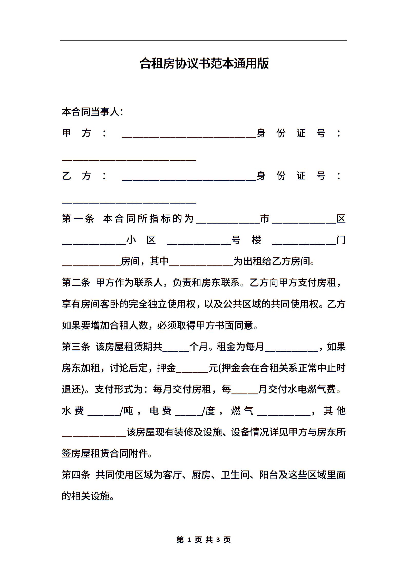 合租房协议书范本通用版