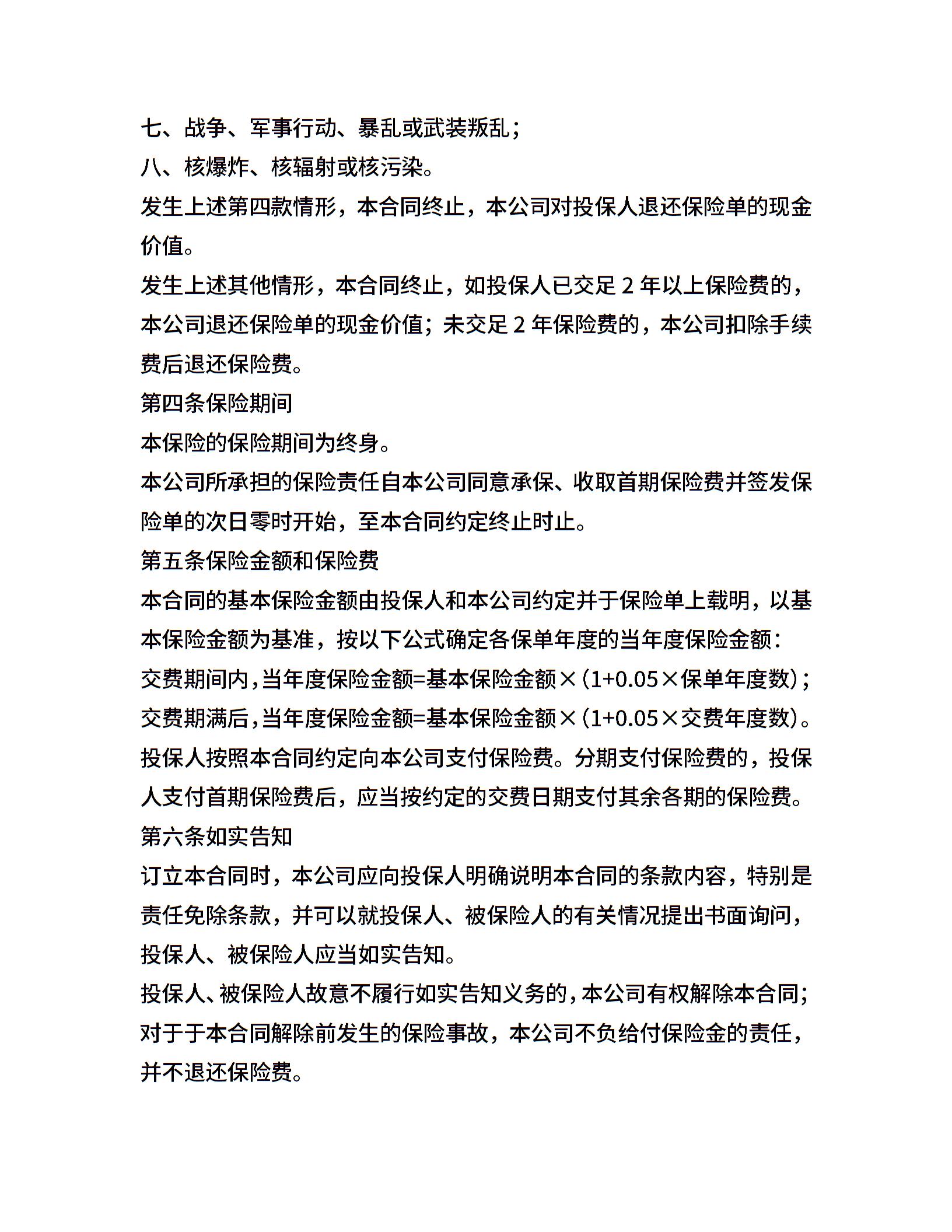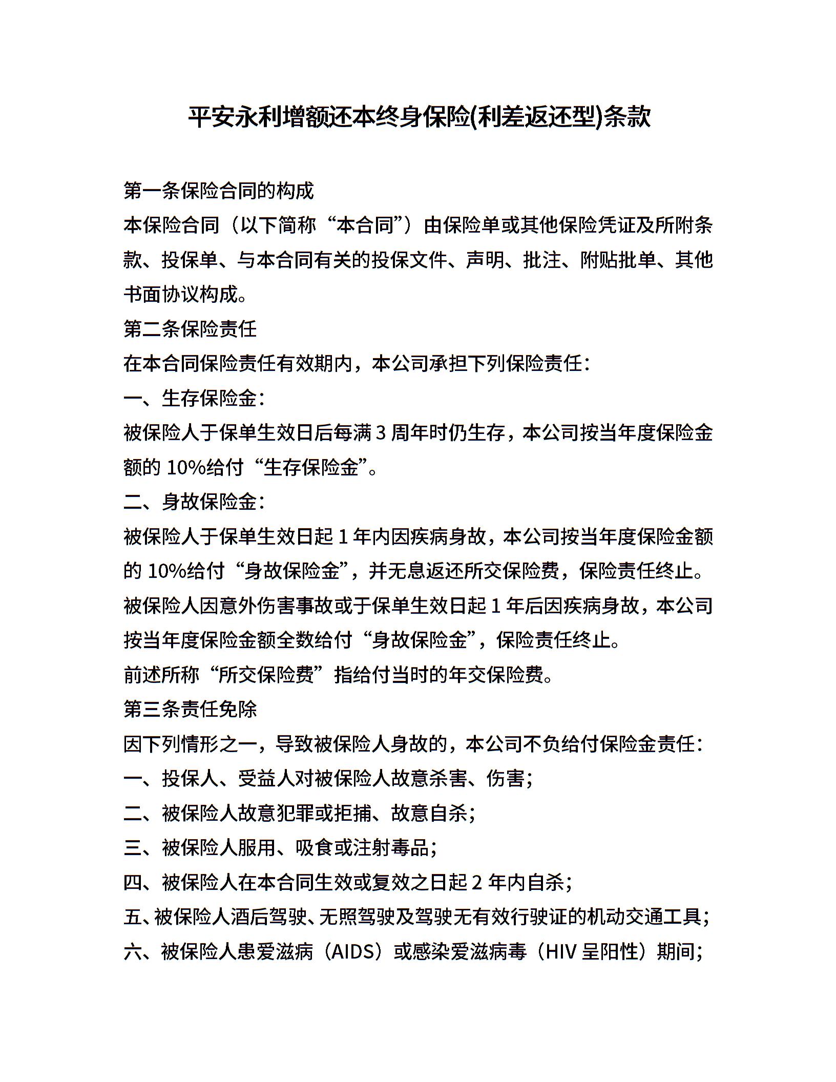 平安永利增额还本终身保险(利差返还型)条款
